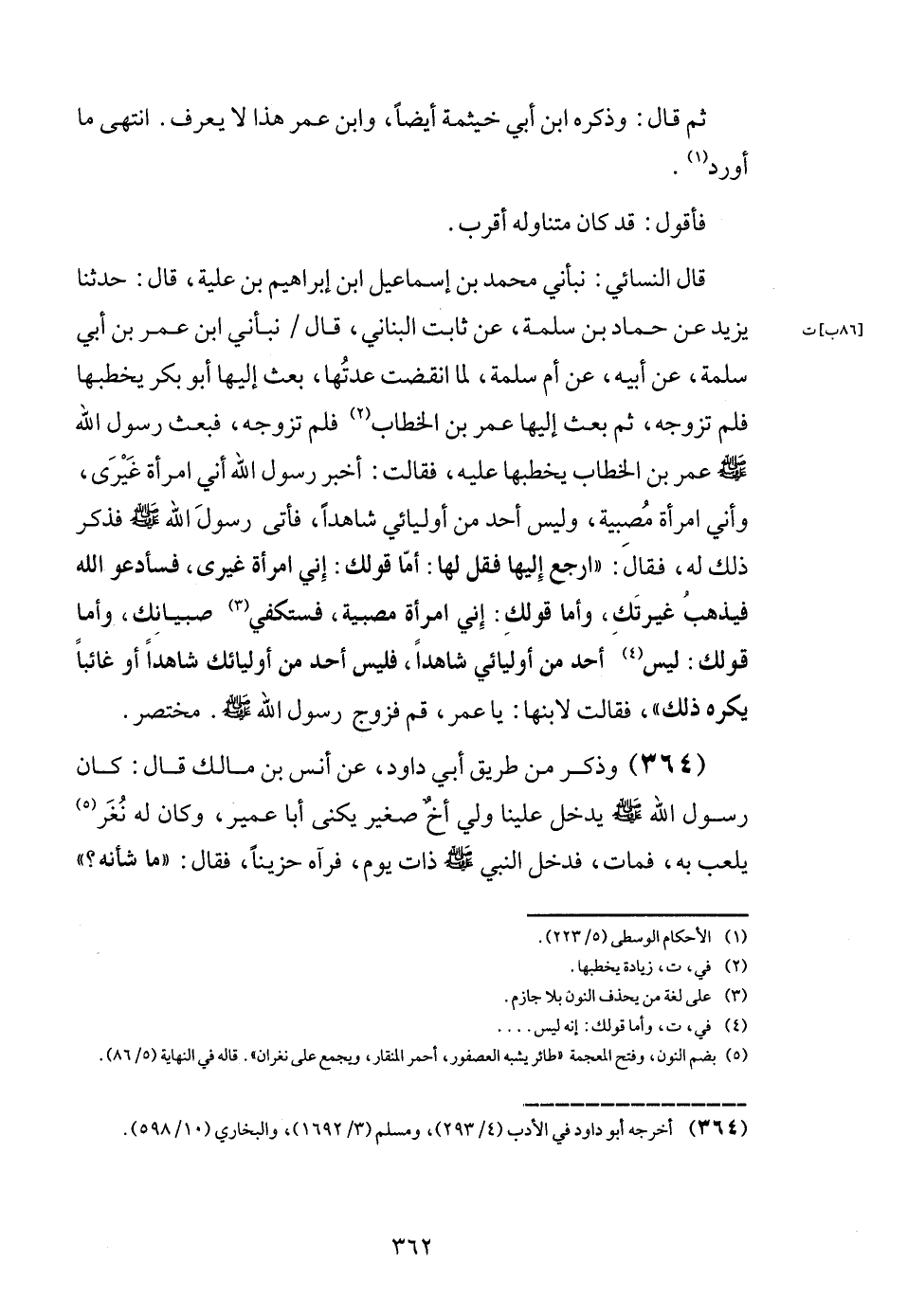 (364) وَذكر من طَرِيق أبي دَاوُد، عَن أنس بن مَالك قَالَ: كَانَ رَسُول الله - صَلَّى اللَّهُ عَلَيْهِ وَسَلَّم َ - يدْخل علينا ولي أَخ صَغِير يكنى أَبَا عُمَيْر، وَكَانَ لَهُ نغر يلْعَب بِهِ، فَمَاتَ، فَدخل النَّبِي - صَلَّى اللَّهُ عَلَيْهِ وَسَلَّم َ - ذَات يَوْم، فَرَآهُ حَزينًا، فَقَالَ: " مَا شَأْنه؟ "
