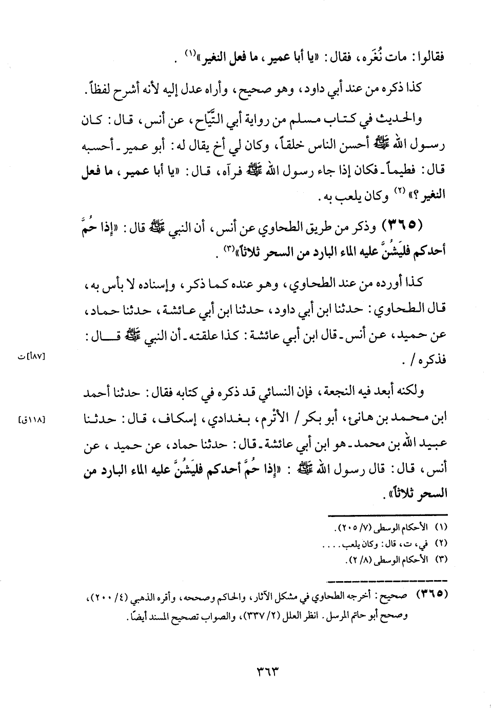 (365) وَذكر من طَرِيق الطَّحَاوِيّ عَن أنس، أَن النَّبِي - صَلَّى اللَّهُ عَلَيْهِ وَسَلَّم َ - قَالَ: " إِذا حم أحدكُم فليشن عَلَيْهِ المَاء الْبَارِد من السحر ثَلَاثًا ".