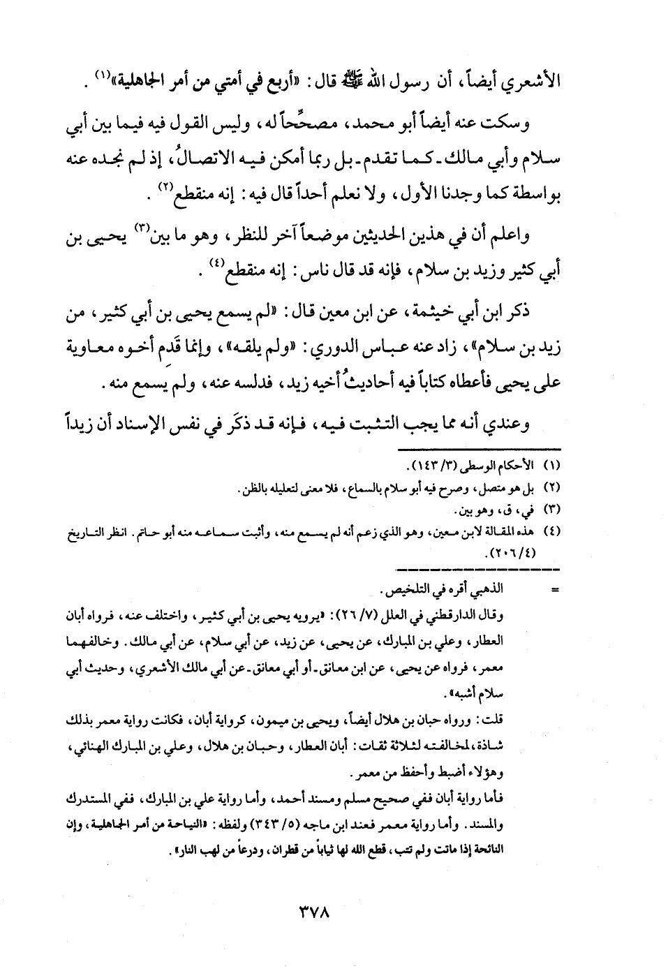 وَأعلم أَن فِي هذَيْن الْحَدِيثين موضعا آخر للنَّظَر، وَهُوَ مَا بَين يحيى بن أبي كثير وَزيد بن سَلام، فَإِنَّهُ قد قَالَ نَاس: إِنَّه مُنْقَطع.