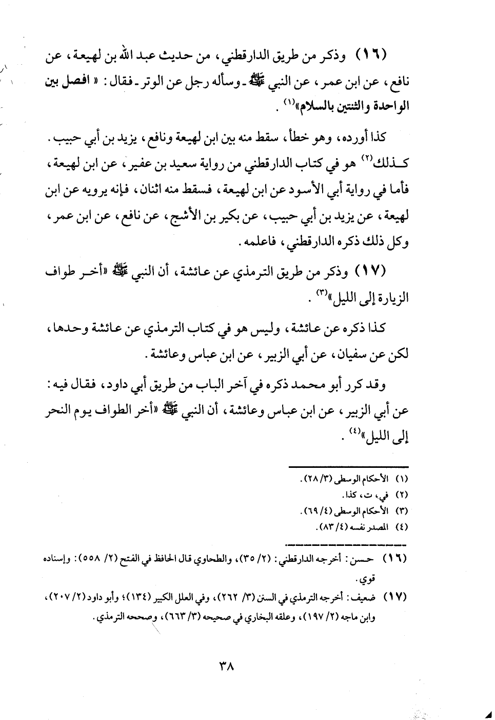(16) وَذكر من طَرِيق الدَّارَقُطْنِيّ، من حَدِيث عبد الله بن لَهِيعَة، عَن نَافِع، عَن ابْن عمر، عَن النَّبِي - صَلَّى اللَّهُ عَلَيْهِ وَسَلَّم َ - وَسَأَلَهُ رجل عَن الْوتر - فَقَالَ: " افصل بَين الْوَاحِدَة والثنتين بِالسَّلَامِ ".