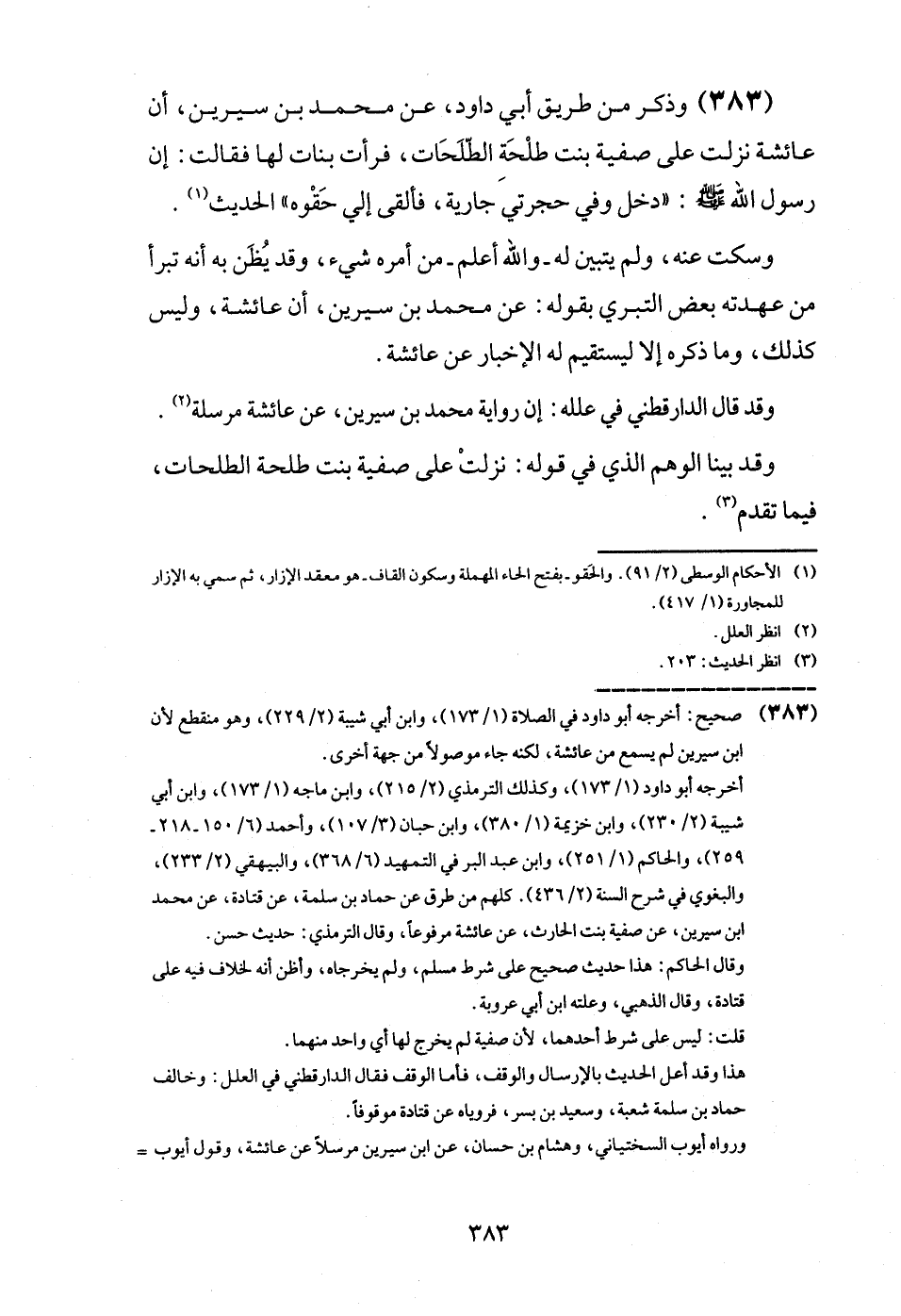 (383) وَذكر من طَرِيق أبي دَاوُد، عَن مُحَمَّد بن سِيرِين، أَن عَائِشَة نزلت على صَفِيَّة بنت طَلْحَة الطلحات، فرأت بَنَات لَهَا فَقَالَت: إِن رَسُول الله - صَلَّى اللَّهُ عَلَيْهِ وَسَلَّم َ -: " دخل وَفِي حُجْرَتي جَارِيَة، فَألْقى إِلَيّ حقوه " الحَدِيث.