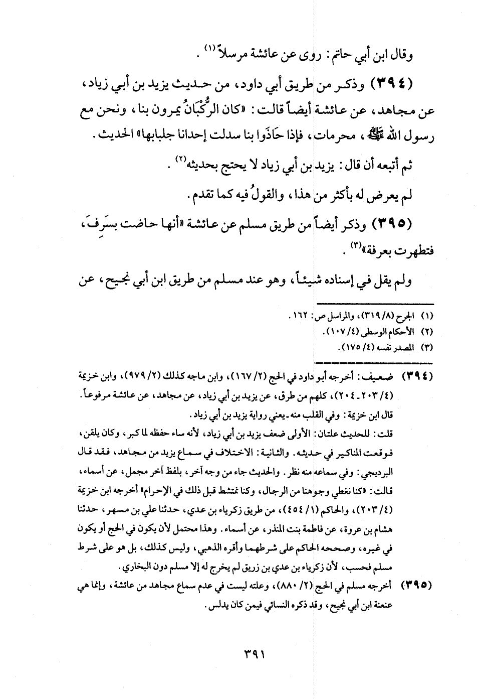 (394) وَذكر من طَرِيق أبي دَاوُد، من حَدِيث يزِيد بن أبي زِيَاد، عَن مُجَاهِد، عَن عَائِشَة أَيْضا قَالَت: " كَانَ الركْبَان يَمرونَ بِنَا، وَنحن مَعَ رَسُول الله - صَلَّى اللَّهُ عَلَيْهِ وَسَلَّم َ -، مُحرمَات، فَإِذا حاذوا بِنَا سدلت إحدانا جلبابها " الحَدِيث.