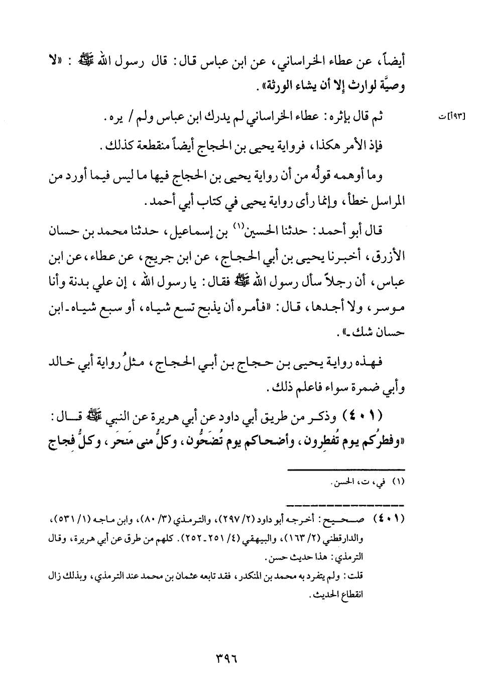 (401) وَذكر من طَرِيق أبي دَاوُد عَن أبي هُرَيْرَة عَن النَّبِي - صَلَّى اللَّهُ عَلَيْهِ وَسَلَّم َ - قَالَ: " وفطركم يَوْم تفطرون، وأضحاكم يَوْم تضحون وكل منى منحر، وكل فجاج