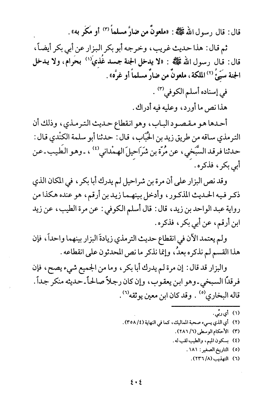 وَقد نَص الْبَزَّار على أَن مرّة بن شرَاحِيل لم يدْرك أَبَا بكر، فِي الْمَكَان الَّذِي ذكر فِيهِ الحَدِيث الْمَذْكُور، وَأدْخل بَينهمَا زيد بن أَرقم، هُوَ عِنْده هَكَذَا من رِوَايَة عبد الْوَاحِد بن زيد، قَالَ: قَالَ أسلم الْكُوفِي: عَن مرّة الطّيب، عَن زيد ابْن أَرقم، عَن أبي بكر، فَذكره.