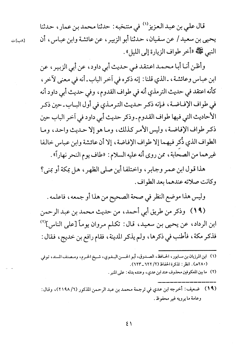 وأظن أَنا أَبَا مُحَمَّد اعْتقد فِي حَدِيث أبي دَاوُد، عَن أبي الزبير، عَن ابْن عَبَّاس وَعَائِشَة /، - الَّذِي قُلْنَا: إِنَّه ذكره فِي آخر الْبَاب - أَنه فِي معنى لآخر، كَأَنَّهُ اعْتقد فِي حَدِيث التِّرْمِذِيّ إِنَّه فِي طواف الْقدوم، وَفِي حَدِيث أبي دَاوُد أَنه فِي طواف الْإِفَاضَة، فَإِنَّهُ ذكر حَدِيث التِّرْمِذِيّ فِي أول الْبَاب - حِين ذكر الْأَحَادِيث الَّتِي فِيهَا طواف الْقدوم - وَذكر حَدِيث أبي دَاوُد فِي آخر الْبَاب حِين ذكر طواف الْإِفَاضَة، وَلَيْسَ الْأَمر كَذَلِك، وَمَا هُوَ إِلَّا حَدِيث وَاحِد، وَمَا الطّواف الَّذِي ذكر فيهمَا إِلَّا طواف الْإِفَاضَة إِلَّا أَن عَائِشَة وَابْن عَبَّاس خالفا غَيرهمَا من الصَّحَابَة، مِمَّن روى أَنه عَلَيْهِ السَّلَام: " طَاف يَوْم النَّحْر نَهَارا ".