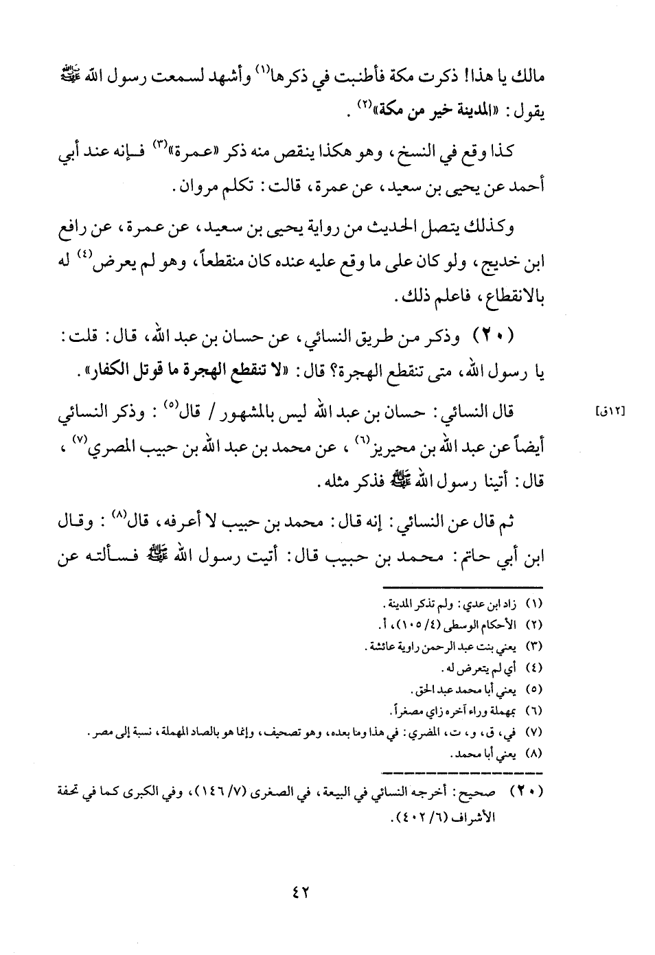 (20) وَذكر من طَرِيق النَّسَائِيّ، عَن حسان بن عبد الله، قَالَ: قلت: يَا رَسُول الله، مَتى تَنْقَطِع الْهِجْرَة؟ قَالَ: " لَا تَنْقَطِع الْهِجْرَة مَا قوتل الْكفَّار ".