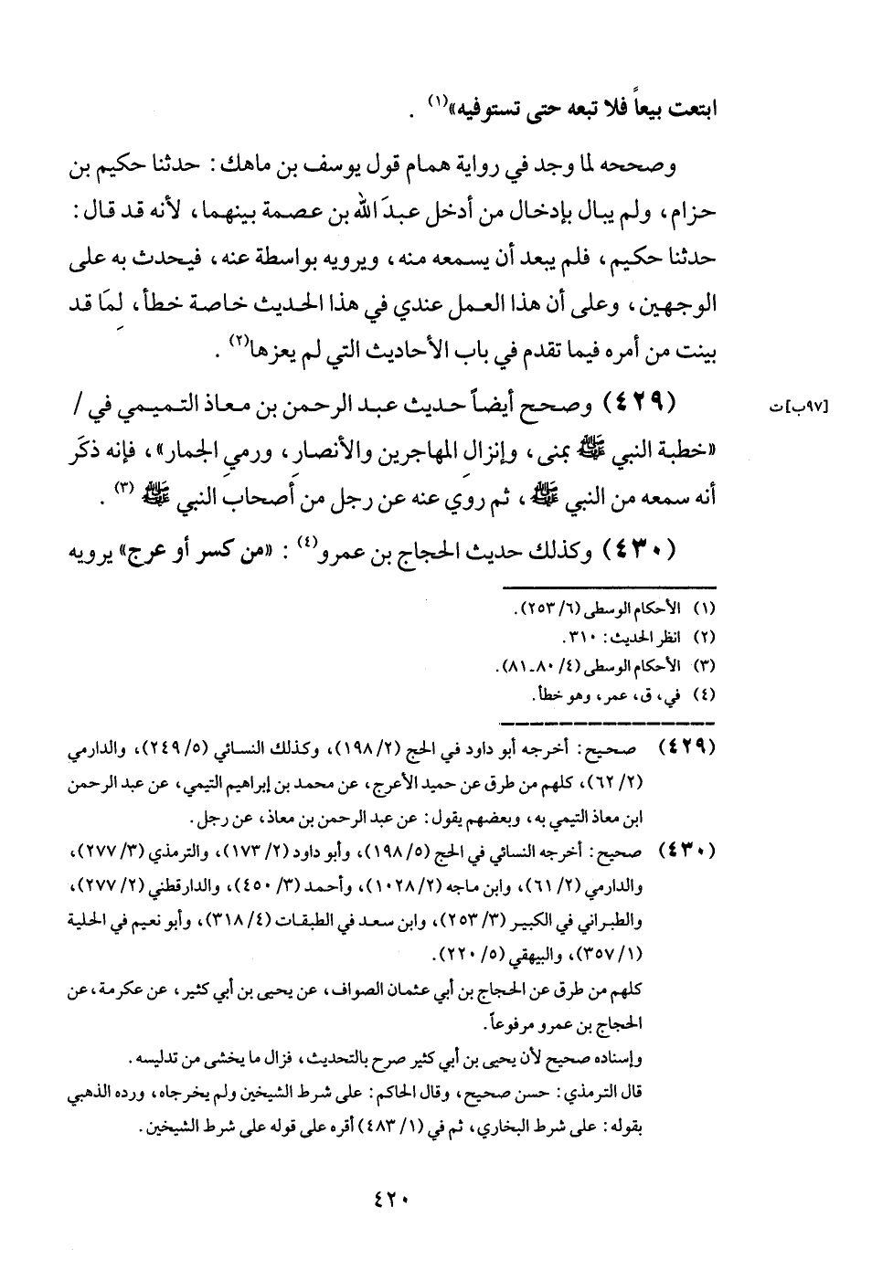 وَصَححهُ لما وجد فِي رِوَايَة همام قَول يُوسُف بن مَاهك: حَدثنَا حَكِيم بن حزَام، وَلم يبال بِإِدْخَال من أَدخل عبد الله بن عصمَة بَينهمَا، لِأَنَّهُ قد قَالَ: حَدثنَا حَكِيم، فَلم يبعد أَن يسمعهُ مِنْهُ، وَيَرْوِيه بِوَاسِطَة عَنهُ، فَيحدث بِهِ على الْوَجْهَيْنِ، وعَلى أَن هَذَا الْعَمَل عِنْدِي فِي هَذَا الحَدِيث خَاصَّة خطأ، لما قد بيّنت من أمره فِيمَا تقدم فِي بَاب الْأَحَادِيث الَّتِي لم يعزها.