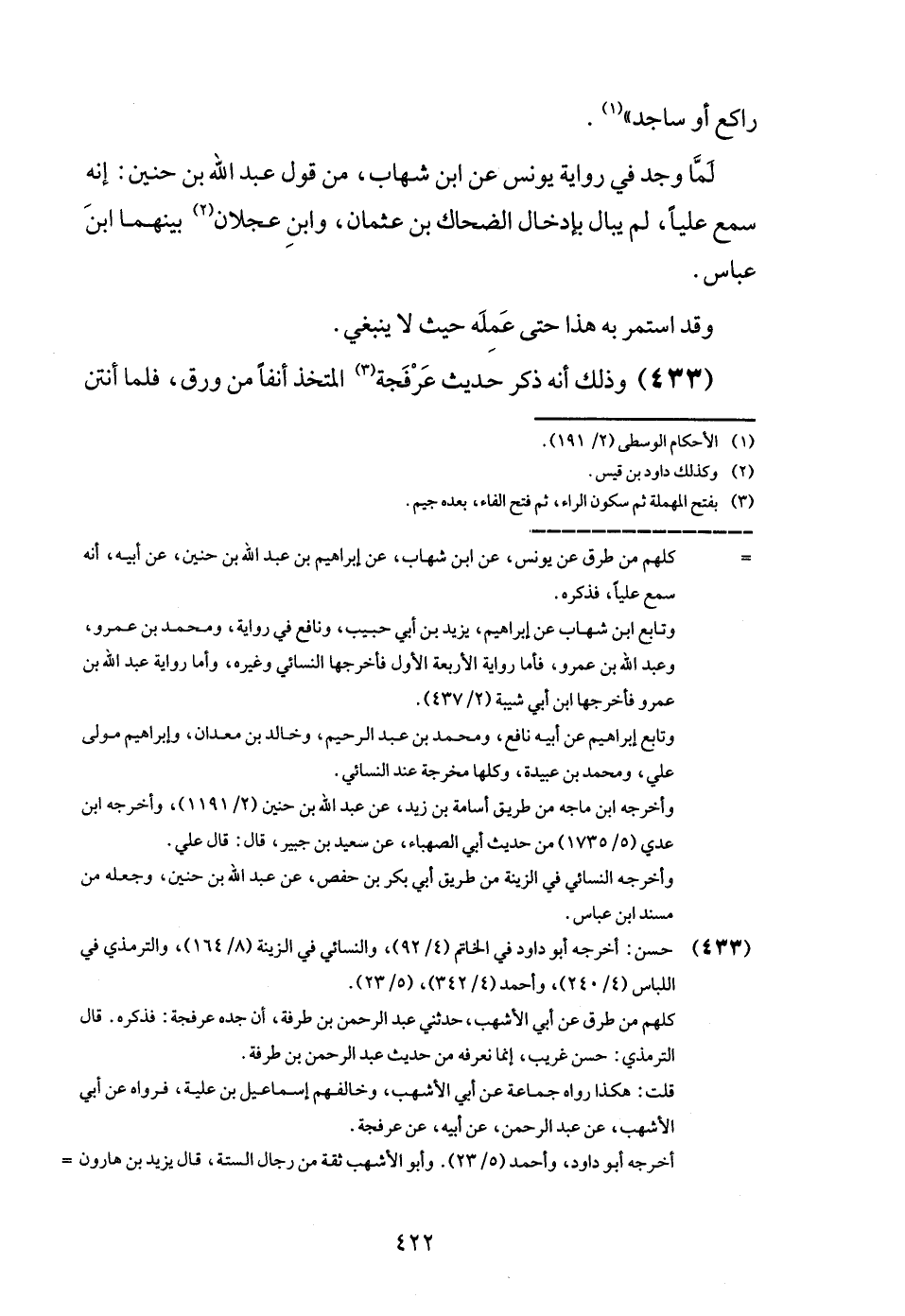 (433) وَذَلِكَ أَنه ذكر حَدِيث عرْفجَة الْمُتَّخذ أنفًا من ورق، فَلَمَّا أنتن