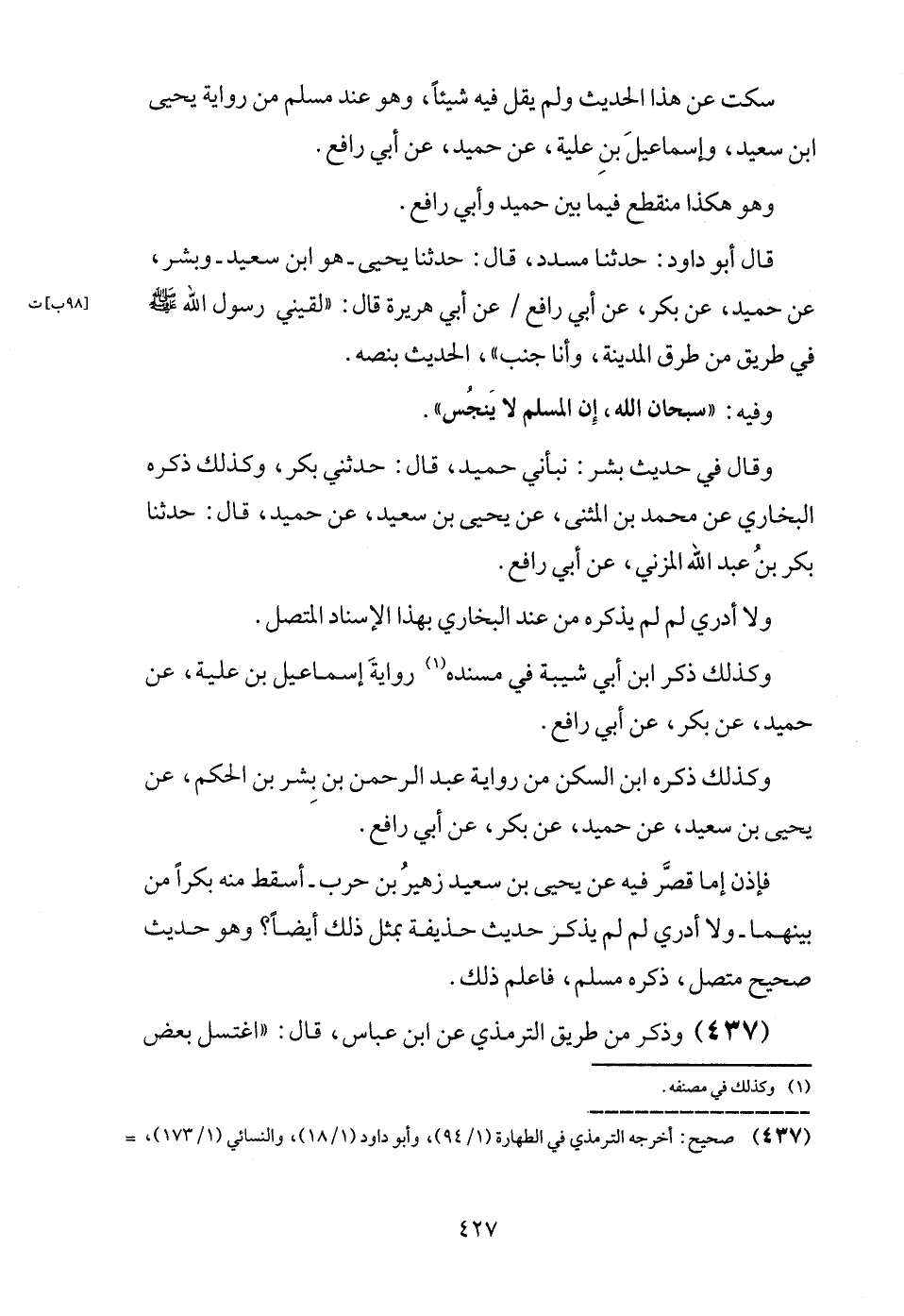 قَالَ أَبُو دَاوُد: حَدثنَا مُسَدّد، قَالَ: حَدثنَا يحيى - هُوَ ابْن سعيد - وَبشر، عَن حميد، عَن بكر، عَن أبي رَافع / عَن أبي هُرَيْرَة قَالَ: " لَقِيَنِي رَسُول الله - صَلَّى اللَّهُ عَلَيْهِ وَسَلَّم َ - فِي طَرِيق من طرق الْمَدِينَة، وَأَنا جنب "، الحَدِيث بنصه.