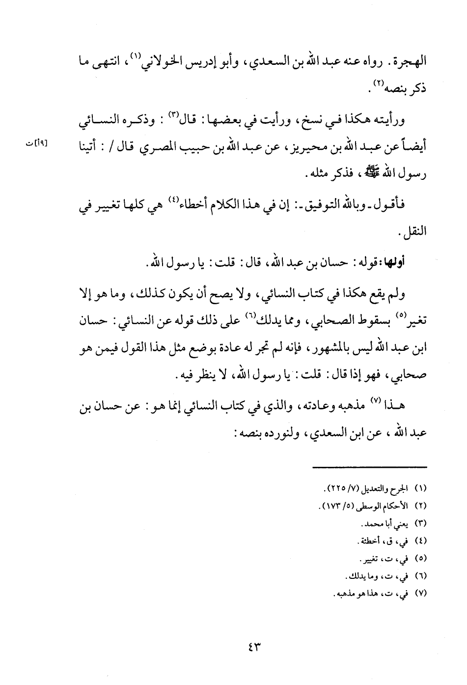 وَلم يَقع هَكَذَا فِي كتاب النَّسَائِيّ، وَلَا يَصح أَن يكون كَذَلِك، وَمَا هُوَ إِلَّا تغير بِسُقُوط الصَّحَابِيّ، وَمِمَّا يدلك على ذَلِك قَوْله عَن النَّسَائِيّ: حسان ابْن عبد الله لَيْسَ بالمشهور، فَإِنَّهُ لم تجر لَهُ عَادَة بِوَضْع مثل هَذَا القَوْل فِيمَن هُوَ صَحَابِيّ، فَهُوَ إِذا قَالَ: قلت: يَا رَسُول الله، لَا ينظر فِيهِ.