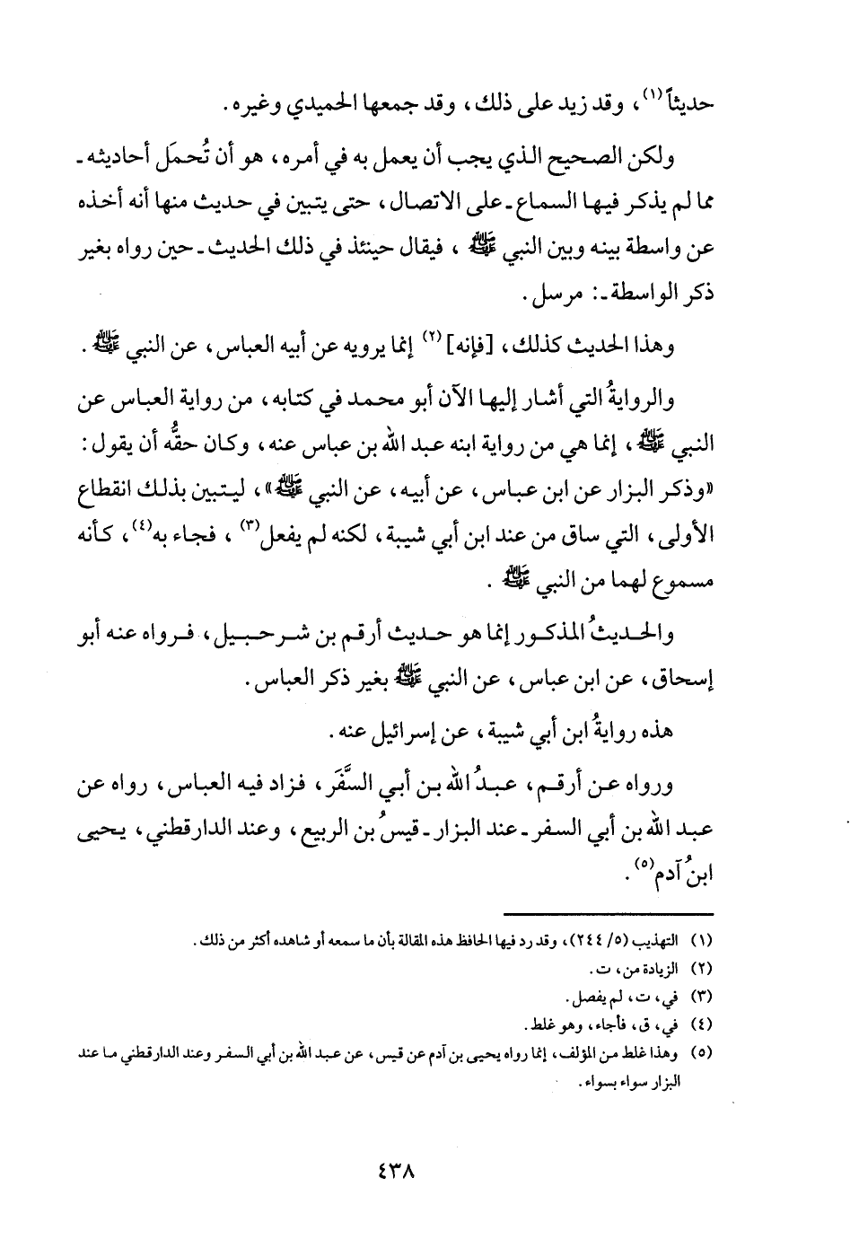 وَالرِّوَايَة الَّتِي أَشَارَ إِلَيْهَا الْآن أَبُو مُحَمَّد فِي كِتَابه، من رِوَايَة الْعَبَّاس عَن النَّبِي - صَلَّى اللَّهُ عَلَيْهِ وَسَلَّم َ -، إِنَّمَا هِيَ من رِوَايَة ابْنه عبد الله بن عَبَّاس عَنهُ، وَكَانَ حَقه أَن يَقُول: " وَذكر الْبَزَّار عَن ابْن عَبَّاس، عَن أَبِيه، عَن النَّبِي - صَلَّى اللَّهُ عَلَيْهِ وَسَلَّم َ - "، ليتبين بذلك انْقِطَاع الأولى، الَّتِي سَاق من عِنْد ابْن أبي شيبَة، لكنه لم يفعل، فجَاء بِهِ، كَأَنَّهُ مسموع لَهما من النَّبِي - صَلَّى اللَّهُ عَلَيْهِ وَسَلَّم َ -.