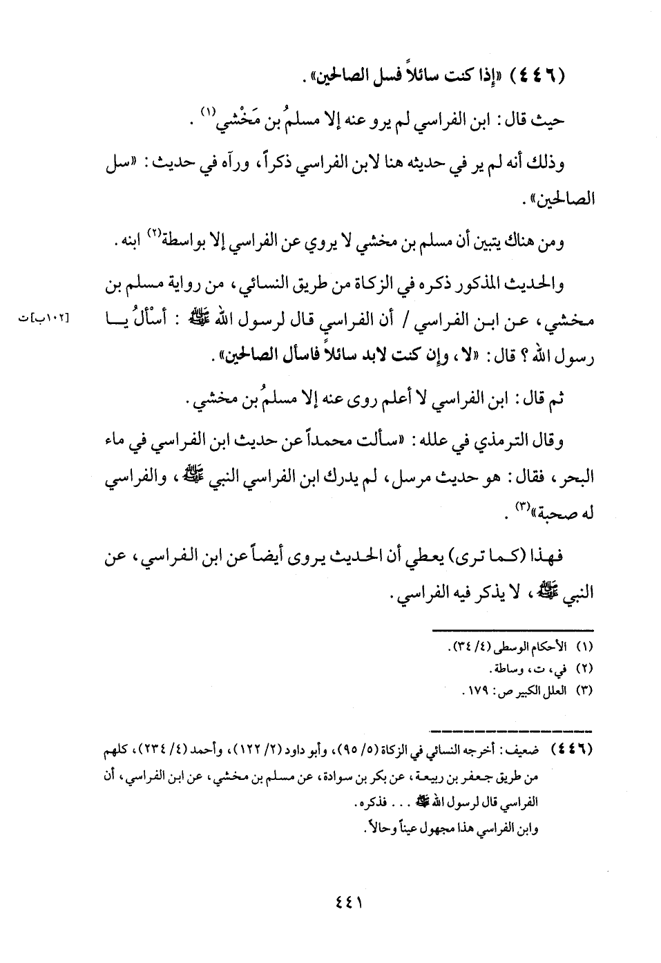 والْحَدِيث الْمَذْكُور ذكره فِي الزَّكَاة من طَرِيق النَّسَائِيّ، من رِوَايَة مُسلم بن مخشي، عَن ابْن الفراسي / أَن الفراسي قَالَ لرَسُول الله - صَلَّى اللَّهُ عَلَيْهِ وَسَلَّم َ -: أسأَل يَا رَسُول الله؟ قَالَ: " لَا، وَإِن كنت لَا بُد سَائِلًا فاسأل الصَّالِحين ".