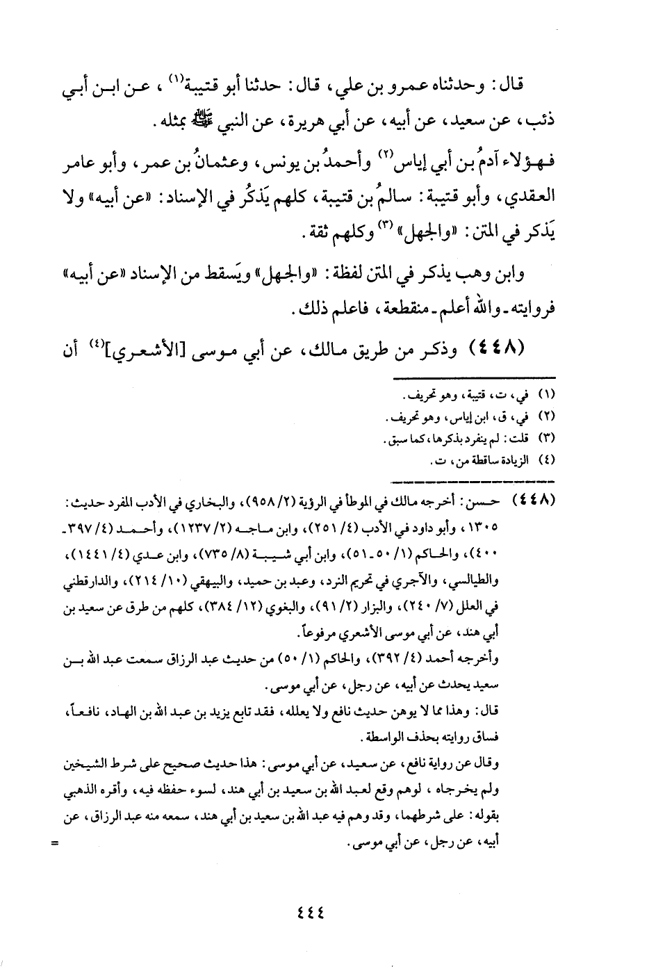 (448) وَذكر من طَرِيق مَالك، عَن أبي مُوسَى [الْأَشْعَرِيّ] أَن