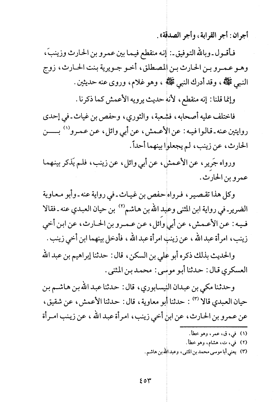 وكل هَذَا تَقْصِير، فَرَوَاهُ حَفْص بن غياث - فِي رِوَايَة عَنهُ - وَأَبُو مُعَاوِيَة الضَّرِير - فِي رِوَايَة ابْن الْمثنى وَعبد الله بن هَاشم بن حَيَّان الْعَبْدي عَنهُ - فَقَالَا فِيهِ: عَن الْأَعْمَش، عَن أبي وَائِل، عَن عَمْرو بن الْحَارِث، عَن ابْن أخي زَيْنَب، امْرَأَة عبد الله، عَن زَيْنَب امْرَأَة عبد الله، فَأدْخل بَينهمَا ابْن أخي زَيْنَب.