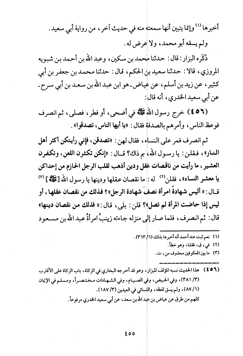 ثمَّ انْصَرف فَمر على النِّسَاء، فَقَالَ لَهُنَّ: " تصدقن، فَإِنِّي رأيتكن أَكثر أهل النَّار "، فَقُلْنَ: يَا رَسُول الله، بِمَ ذَاك؟ قَالَ: " إنكن تكثرن اللَّعْن، وتكفرن العشير، مَا رَأَيْت من ناقصات عقل وَدين أذهب لقلب الرجل الحازم من إحداكن يَا معشر النِّسَاء "، فَقُلْنَ: لَهُ: مَا نُقْصَان عقلهَا ودينها يَا رَسُول الله - صَلَّى اللَّهُ عَلَيْهِ وَسَلَّم َ - قَالَ: " أَلَيْسَ شَهَادَة امْرَأَة نصف شَهَادَة الرجل "؟ فَذَلِك من نُقْصَان عقلهَا، أَو لَيْسَ إِذا حَاضَت الْمَرْأَة لم تصل "؟ قُلْنَ: بلَى، قَالَ: " فَذَلِك من نُقْصَان دينهَا " قَالَ: ثمَّ انْصَرف، فَلَمَّا صَار إِلَى منزله جَاءَتْهُ زَيْنَب امْرَأَة عبد الله بن مَسْعُود