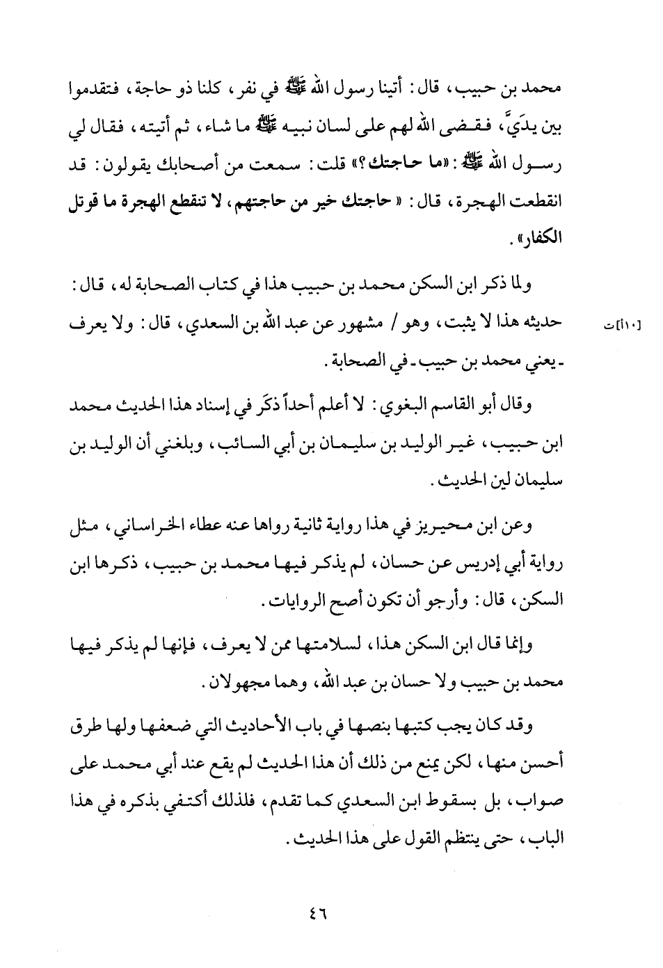 مُحَمَّد بن حبيب، قَالَ: أَتَيْنَا رَسُول الله - صَلَّى اللَّهُ عَلَيْهِ وَسَلَّم َ - فِي نفر، كلنا ذُو حَاجَة، فتقدموا بَين يَدي، فَقضى الله لَهُم على لِسَان نبيه - صَلَّى اللَّهُ عَلَيْهِ وَسَلَّم َ - مَا شَاءَ، ثمَّ أَتَيْته، فَقَالَ لي رَسُول الله - صَلَّى اللَّهُ عَلَيْهِ وَسَلَّم َ -: " مَا حَاجَتك؟ " قلت: سَمِعت من أَصْحَابك يَقُولُونَ: قد انْقَطَعت الْهِجْرَة، قَالَ: " حَاجَتك خير من حَاجتهم، لَا تَنْقَطِع الْهِجْرَة مَا قوتل الْكفَّار ".