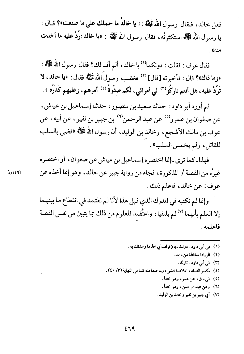 ثمَّ أورد أَبُو دَاوُد: حَدثنَا سعيد بن مَنْصُور، حَدثنَا إِسْمَاعِيل بن عَيَّاش، عَن صَفْوَان بن عَمْرو عَن عبد الرَّحْمَن بن جُبَير بن نفير، عَن أَبِيه، عَن عَوْف بن مَالك الأشجع، وخَالِد بن الْوَلِيد، أَن رَسُول الله - صَلَّى اللَّهُ عَلَيْهِ وَسَلَّم َ - " قضى بالسلب للْقَاتِل، وَلم يُخَمّس السَّلب ".