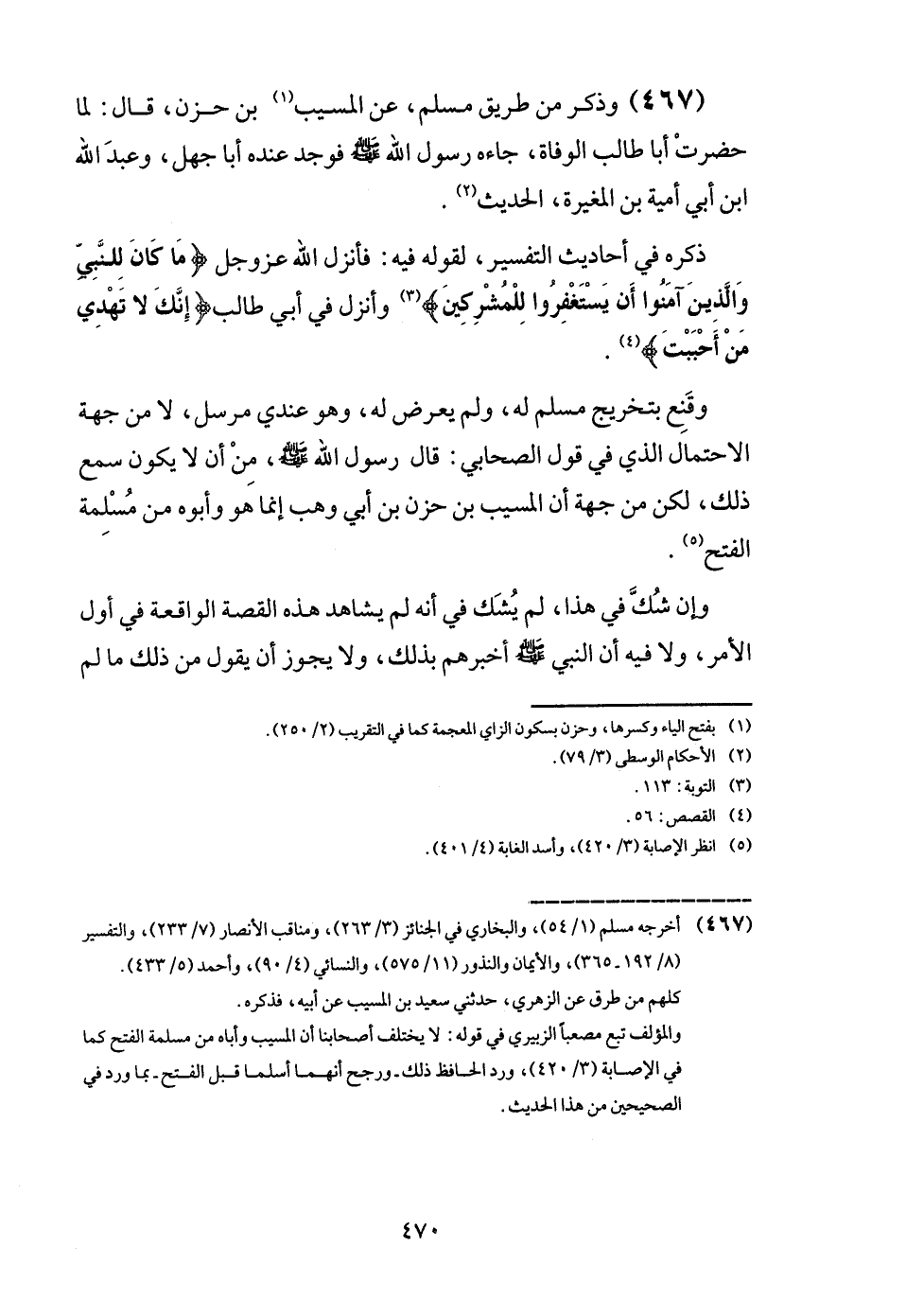 (467) وَذكر من طَرِيق مُسلم، عَن الْمسيب بن حزن، قَالَ: لما حضرت أَبَا طَالب الْوَفَاة، جَاءَهُ رَسُول الله - صَلَّى اللَّهُ عَلَيْهِ وَسَلَّم َ - فَوجدَ عِنْده أَبَا جهل، وَعبد الله ابْن أبي أُميَّة بن الْمُغيرَة، الحَدِيث.