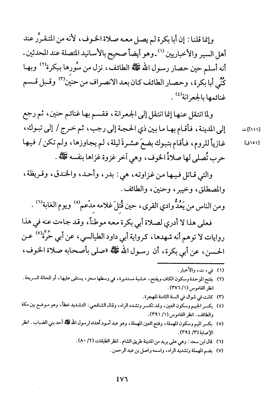 وَإِنَّمَا قُلْنَا: إِن أَبَا بكرَة لم يصل مَعَه صَلَاة الْخَوْف، لِأَنَّهُ من المتقرر عِنْد أهل السّير والأخباريين - وَهُوَ أَيْضا صَحِيح بِالْأَسَانِيدِ الْمُتَّصِلَة عِنْد الْمُحدثين - أَنه أسلم حِين حِصَار رَسُول الله - صَلَّى اللَّهُ عَلَيْهِ وَسَلَّم َ - الطَّائِف، نزل من سورها ببكرة وَبهَا كني أَبَا بكرَة، وحصار الطَّائِف كَانَ بعد الِانْصِرَاف من حنين وَقبل قسم غنائمها بالجعرانة.