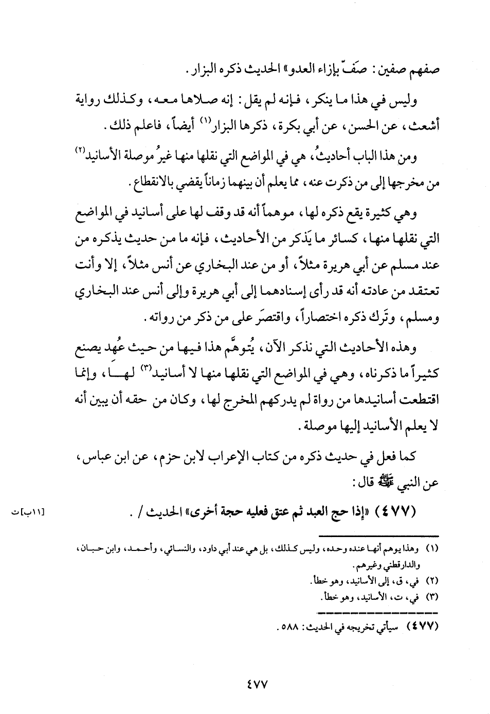 وَهِي كَثِيرَة يَقع ذكره لَهَا، موهما أَنه قد وقف لَهَا على أَسَانِيد فِي الْمَوَاضِع الَّتِي نقلهَا مِنْهَا، كَسَائِر مَا يذكر من الْأَحَادِيث، فَإِنَّهُ مَا من حَدِيث يذكرهُ من عِنْد مُسلم عَن أبي هُرَيْرَة مثلا، أَو من عِنْد البُخَارِيّ عَن أنس مثلا، إِلَّا وَأَنت تعتقد من عَادَته أَنه قد رأى إسنادهما إِلَى أبي هُرَيْرَة وَإِلَى أنس عِنْد البُخَارِيّ وَمُسلم، وَترك ذكره اختصارا، وَاقْتصر على من ذكر من رُوَاته.