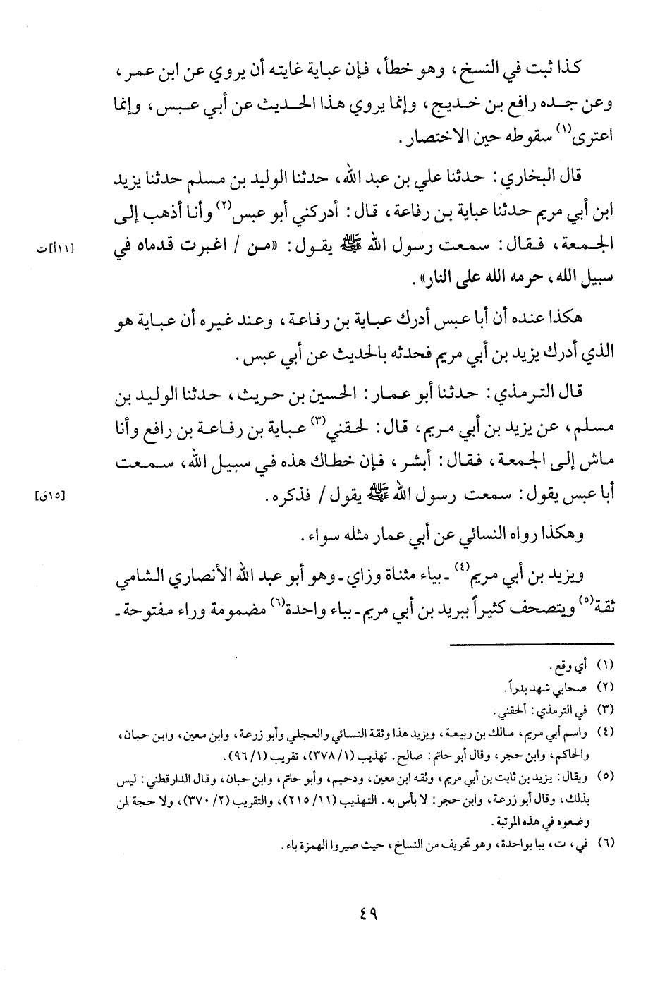 قَالَ البُخَارِيّ: حَدثنَا عَليّ بن عبد الله، حَدثنَا الْوَلِيد بن مُسلم حَدثنَا يزِيد ابْن أبي مَرْيَم حَدثنَا عَبَايَة بن رِفَاعَة، قَالَ: أدركني أَبُو عبس وَأَنا أذهب إِلَى الْجُمُعَة، فَقَالَ: سَمِعت رَسُول الله - صَلَّى اللَّهُ عَلَيْهِ وَسَلَّم َ - يَقُول: " من / اغبرت قدماه فِي سببيل الله، حرمه الله على النَّار ". هَكَذَا عِنْده أَن أَبَا عبس أدْرك عَبَايَة بن رِفَاعَة، وَعند غَيره أَن عَبَايَة هُوَ الَّذِي أدْرك يزِيد بن أبي مَرْيَم فحدثه بِالْحَدِيثِ عَن أبي عبس.