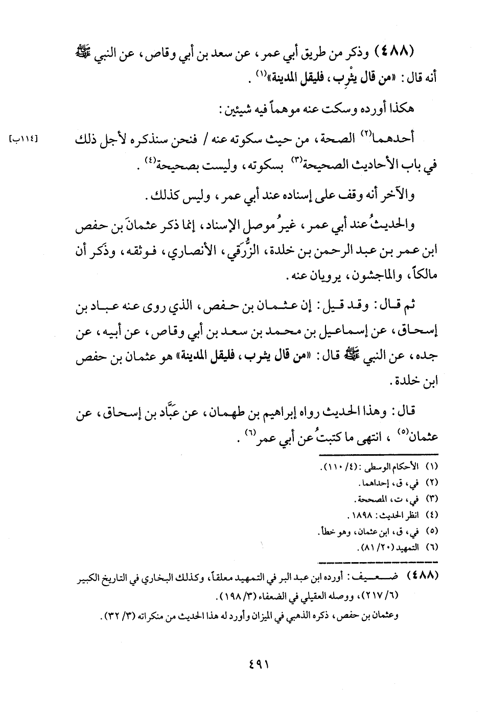 (488) وَذكر من طَرِيق أبي عمر، عَن سعد بن أبي وَقاص، عَن النَّبِي - صَلَّى اللَّهُ عَلَيْهِ وَسَلَّم َ - أَنه قَالَ: " من قَالَ يثرب، فَلْيقل الْمَدِينَة ".