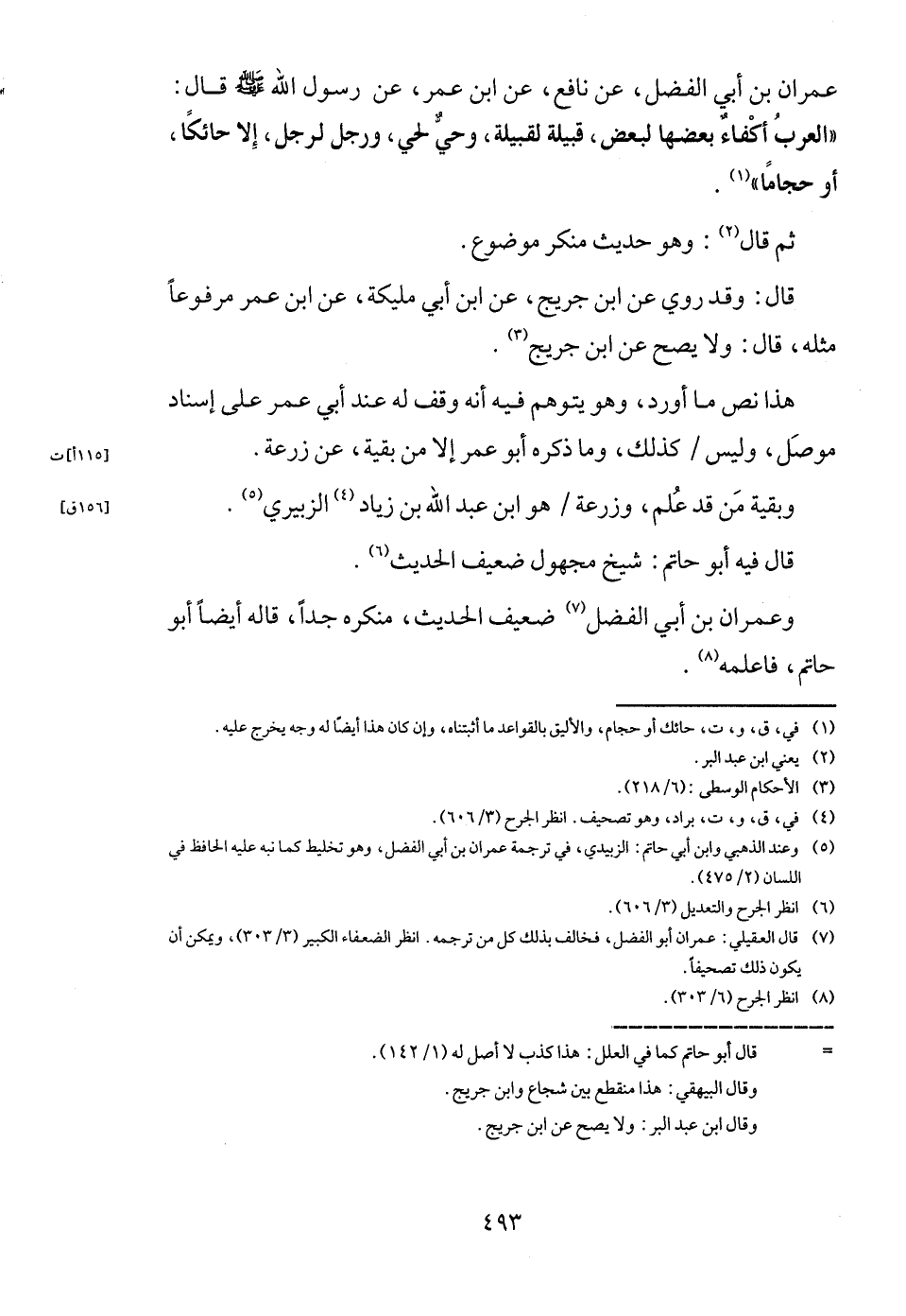 عمرَان بن أبي الْفضل، عَن نَافِع، عَن ابْن عمر، عَن رَسُول الله - صَلَّى اللَّهُ عَلَيْهِ وَسَلَّم َ - قَالَ: " الْعَرَب أكفاء بَعْضهَا لبَعض، قَبيلَة لقبيلة، وَحي لحي، وَرجل لرجل، إِلَّا حائكا، أَو حجاما ".