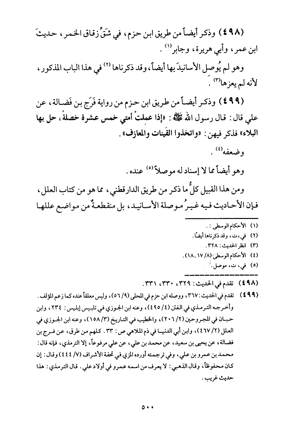 (499) وَذكر أَيْضا من طَرِيق ابْن حزم من رِوَايَة فرج بن فضَالة، عَن عَليّ قَالَ: قَالَ رَسُول الله - صَلَّى اللَّهُ عَلَيْهِ وَسَلَّم َ -: " إِذا عملت أمتِي خمس عشرَة خصْلَة، حل بهَا الْبلَاء " فَذكر فِيهِنَّ: " وَاتَّخذُوا الْقَيْنَات وَالْمَعَازِف ". وَضَعفه.