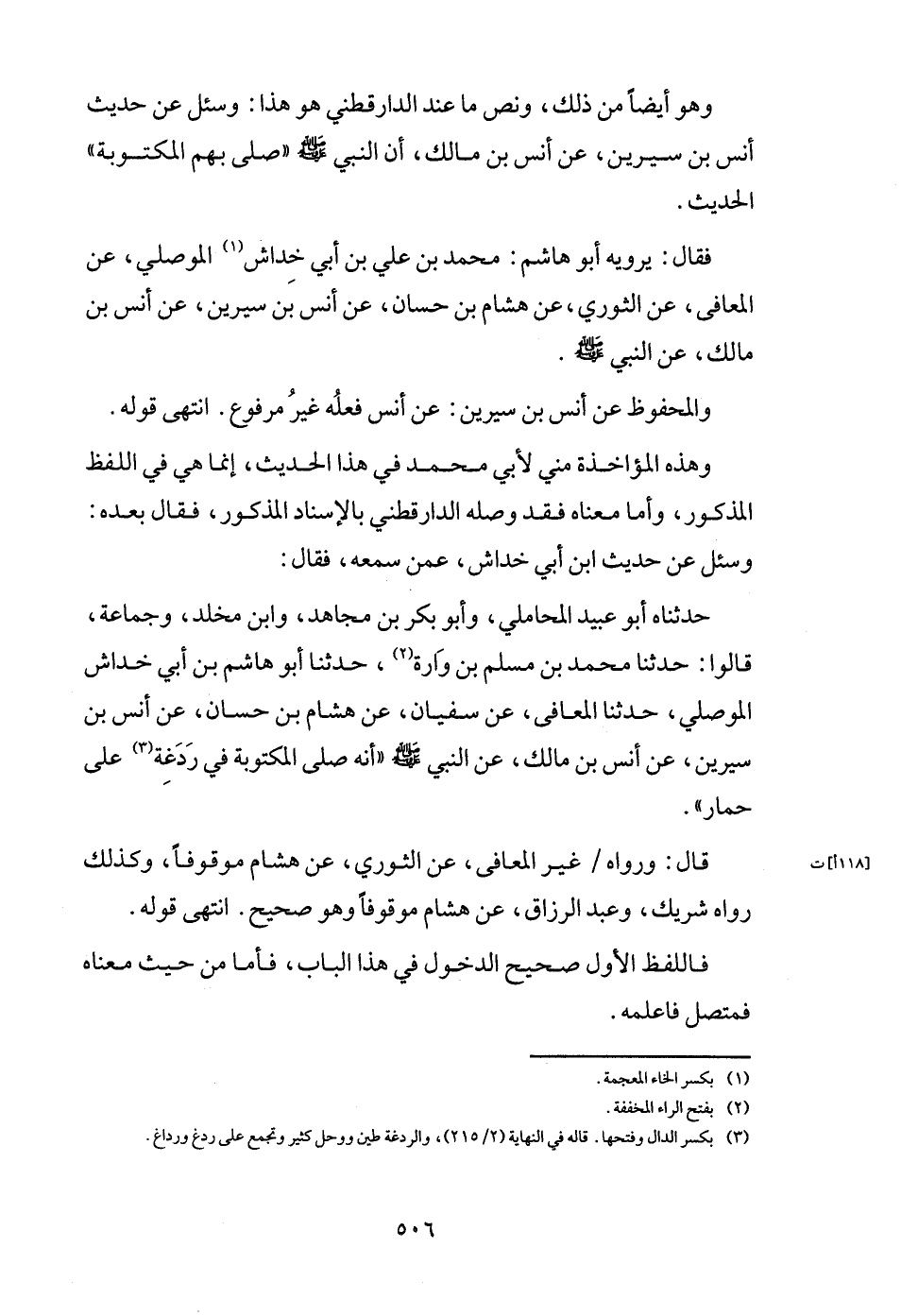 وَهَذِه الْمُؤَاخَذَة مني لأبي مُحَمَّد فِي هَذَا الحَدِيث، إِنَّمَا هِيَ فِي اللَّفْظ الْمَذْكُور، وَأما مَعْنَاهُ فقد وَصله الدَّارَقُطْنِيّ بِالْإِسْنَادِ الْمَذْكُور، فَقَالَ بعده: وَسُئِلَ عَن حَدِيث ابْن أبي خِدَاش، عَمَّن سَمعه، فَقَالَ: حدّثنَاهُ أَبُو عبيد الْمحَامِلِي، وَأَبُو بكر بن مُجَاهِد، وَابْن مخلد، وَجَمَاعَة، قَالُوا: حَدثنَا مُحَمَّد بن مُسلم بن وارة، حَدثنَا أَبُو هَاشم بن أبي خِدَاش الْموصِلِي، حَدثنَا الْمعَافى، عَن سُفْيَان، عَن هِشَام بن حسان، عَن أنس ابْن سِيرِين، عَن أنس بن مَالك، عَن النَّبِي - صَلَّى اللَّهُ عَلَيْهِ وَسَلَّم َ - " أَنه صلى الْمَكْتُوبَة فِي ردغة على حمَار ".