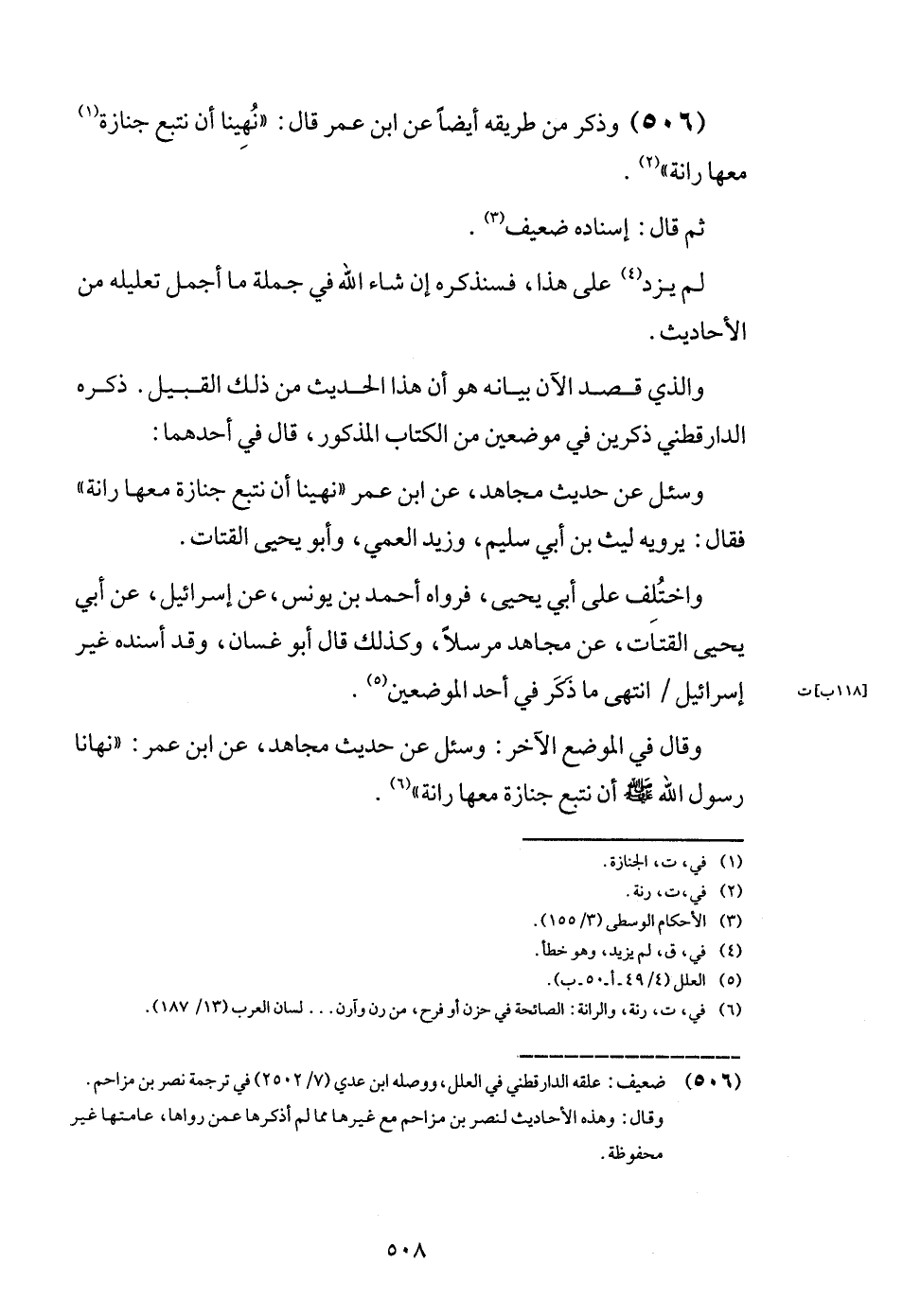 وَالَّذِي قصد الْآن بَيَانه هُوَ أَن هَذَا الحَدِيث من ذَلِك الْقَبِيل. ذكره الدَّارَقُطْنِيّ ذكرين فِي موضِعين من الْكتاب الْمَذْكُور، قَالَ فِي أَحدهمَا: وَسُئِلَ عَن حَدِيث مُجَاهِد، عَن ابْن عمر " نهينَا أَن نتبع جَنَازَة مَعهَا رانة " فَقَالَ: يرويهِ لَيْث بن أبي سليم، وَزيد الْعمي، وَأَبُو يحيى القَتَّات.
