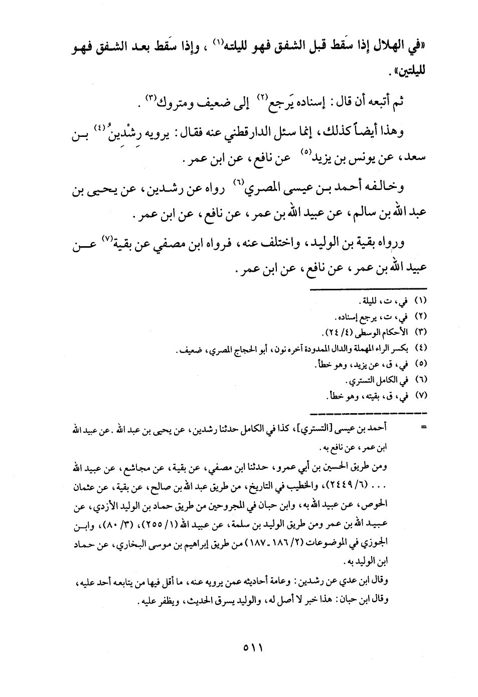 " فِي الْهلَال إِذا سقط قبل الشَّفق فَهُوَ لليلته، وَإِذا سقط بعد الشَّفق فَهُوَ لليلتين ".