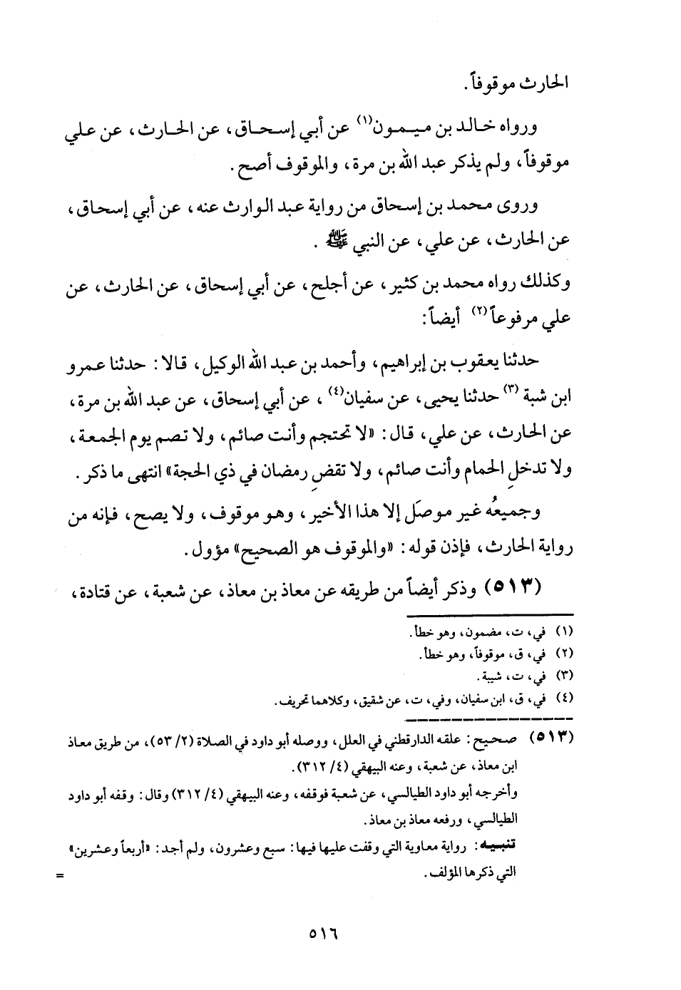 وجميعه غير موصل إِلَّا هَذَا الْأَخير، وَهُوَ مَوْقُوف، وَلَا يَصح، فَإِنَّهُ من رِوَايَة الْحَارِث، فَإِذن قَوْله: " وَالْمَوْقُوف هُوَ الصَّحِيح " مؤول.