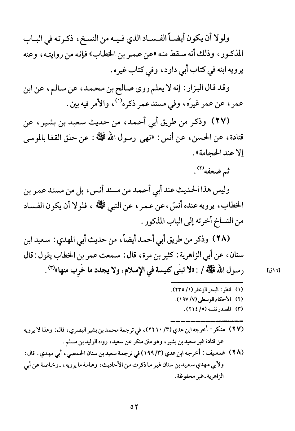 (28) وَذكر من طَرِيق أبي أَحْمد أَيْضا، من حَدِيث أبي الْمهْدي: سعيد ابْن سِنَان عَن أبي الزَّاهِرِيَّة: كثير بن مرّة، قَالَ: سَمِعت عمر بن الْخطاب يَقُول: قَالَ رَسُول الله - صَلَّى اللَّهُ عَلَيْهِ وَسَلَّم َ - /: " لَا تبنى كَنِيسَة فِي الْإِسْلَام، وَلَا يجدد مَا خرب مِنْهَا ".