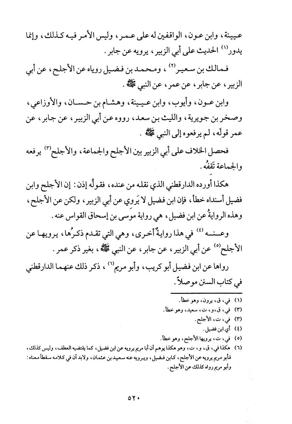 هَكَذَا أوردهُ الدَّارَقُطْنِيّ الَّذِي نَقله من عِنْده، فَقَوله إِذن: إِن الْأَجْلَح وَابْن فُضَيْل أسنداه خطأ، فَإِن ابْن فُضَيْل لَا يروي عَن أبي الزبير، وَلَكِن عَن الْأَجْلَح، وَهَذِه الرِّوَايَة عَن ابْن فُضَيْل، هِيَ رِوَايَة مُوسَى بن إِسْحَاق القواس عَنهُ.