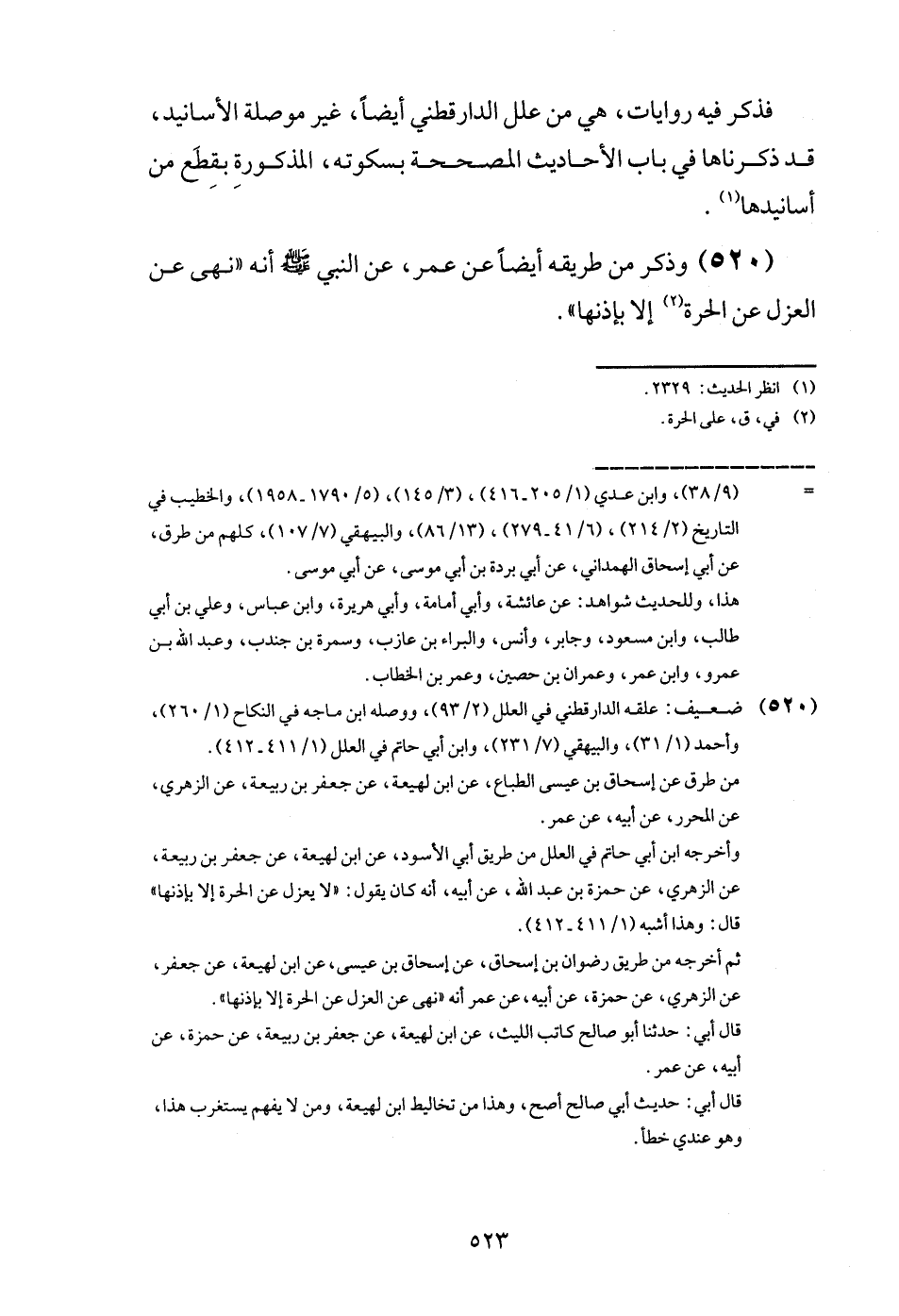 (520) وَذكر من طَرِيقه أَيْضا عَن عمر، عَن النَّبِي - صَلَّى اللَّهُ عَلَيْهِ وَسَلَّم َ - أَنه " نهى عَن الْعَزْل عَن الْحرَّة إِلَّا بِإِذْنِهَا ".