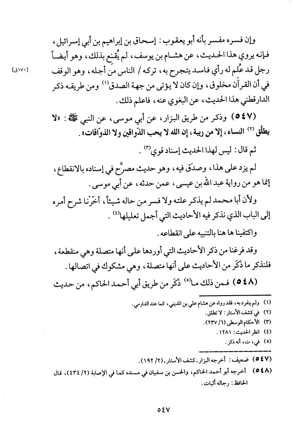 (547) وَذكر من طَرِيق الْبَزَّار، عَن أبي مُوسَى، عَن النَّبِي - صَلَّى اللَّهُ عَلَيْهِ وَسَلَّم َ -: " لَا يُطلق النِّسَاء إِلَّا من رِيبَة، إِن الله لَا يحب الذواقين وَلَا الذواقات ".
