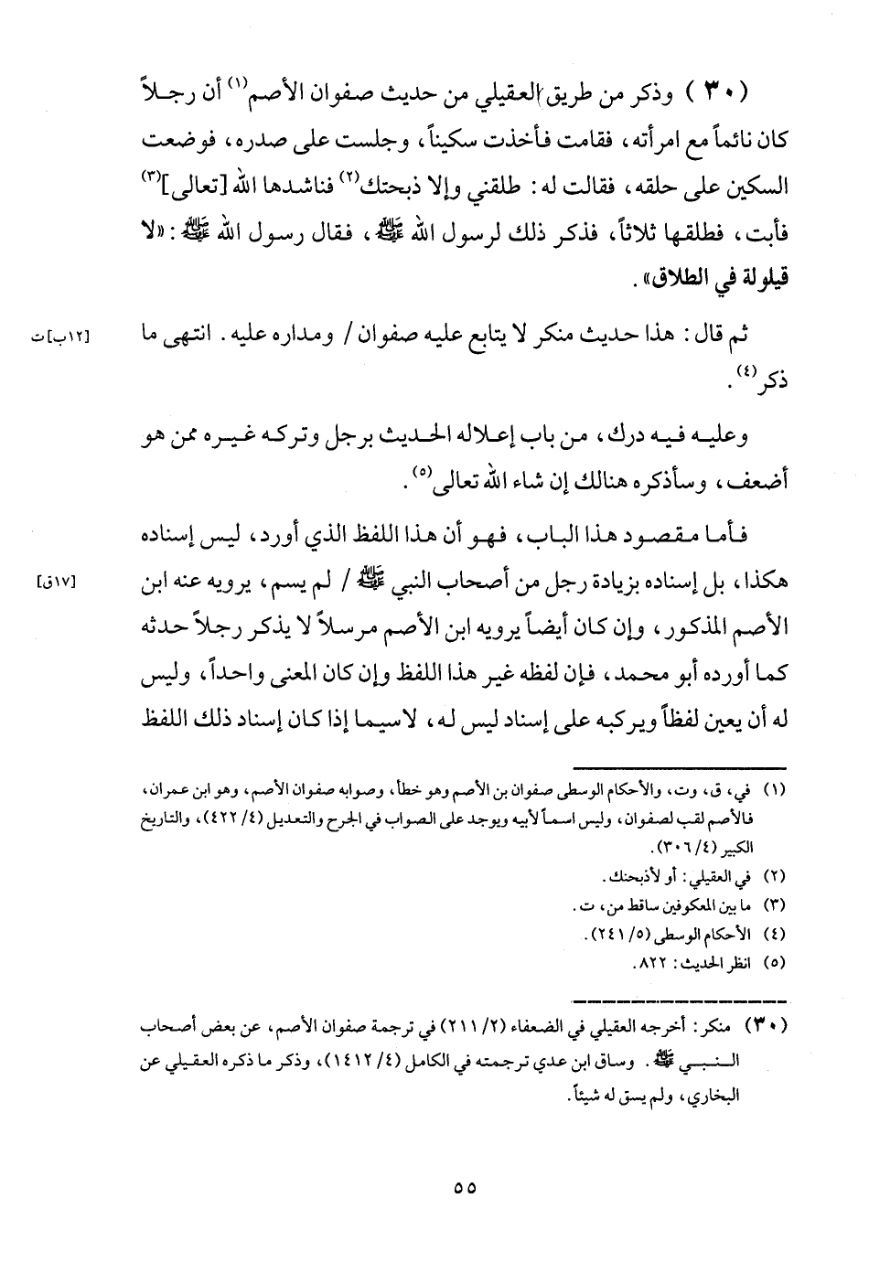 (30) وَذكر من طَرِيق الْعقيلِيّ من حَدِيث صَفْوَان الْأَصَم أَن رجلا كَانَ نَائِما مَعَ امْرَأَته، فَقَامَتْ فَأخذت سكيناً، وَجَلَست على صَدره، فَوضعت السكين على حلقه، فَقَالَت لَهُ: طَلقنِي وَإِلَّا ذبحتك فناشدها الله [تَعَالَى] فَأَبت، فَطلقهَا ثَلَاثًا، فَذكر ذَلِك لرَسُول الله - صَلَّى اللَّهُ عَلَيْهِ وَسَلَّم َ -، فَقَالَ رَسُول الله - صَلَّى اللَّهُ عَلَيْهِ وَسَلَّم َ -: " لَا قيلولة فِي الطَّلَاق ".