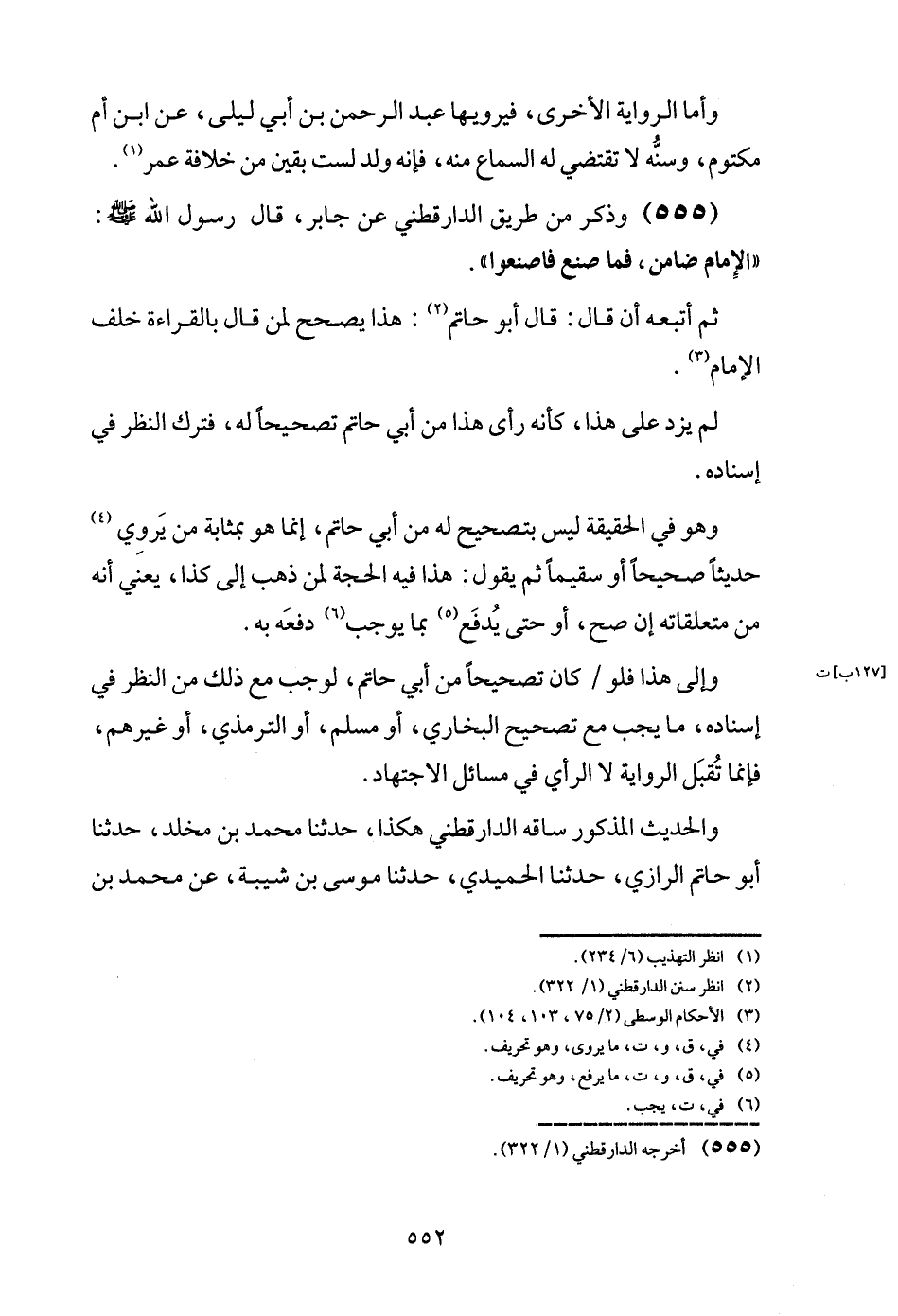 (555) وَذكر من طَرِيق الدَّارَقُطْنِيّ عَن جَابر، قَالَ رَسُول الله - صَلَّى اللَّهُ عَلَيْهِ وَسَلَّم َ -: " الإِمَام ضَامِن، فَمَا صنع فَاصْنَعُوا ".