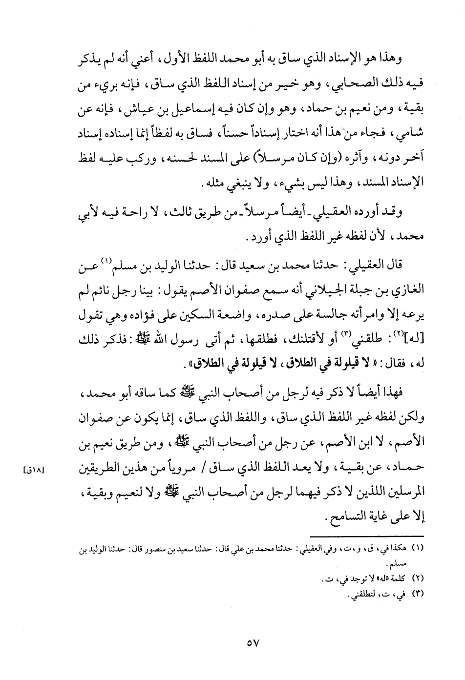 فَهَذَا أَيْضا لَا ذكر فِيهِ لرجل من أَصْحَاب النَّبِي - صَلَّى اللَّهُ عَلَيْهِ وَسَلَّم َ - كَمَا سَاقه أَبُو مُحَمَّد وَلَكِن لَفظه غير اللَّفْظ الَّذِي سَاق، وَاللَّفْظ الَّذِي سَاق، إِنَّمَا يكون عَن صَفْوَان الْأَصَم، لَا ابْن الْأَصَم، عَن رجل من أَصْحَاب النَّبِي - صَلَّى اللَّهُ عَلَيْهِ وَسَلَّم َ -، وَمن طَرِيق نعيم بن حَمَّاد، عَن بَقِيَّة، وَلَا يعد اللَّفْظ الَّذِي سَاق / مروياً من هذَيْن الطَّرِيقَيْنِ الْمُرْسلين اللَّذين لَا ذكر فيهمَا لرجل من أَصْحَاب النَّبِي - صَلَّى اللَّهُ عَلَيْهِ وَسَلَّم َ - وَلَا لنعيم وَبَقِيَّة، إِلَّا على غَايَة التسامح.