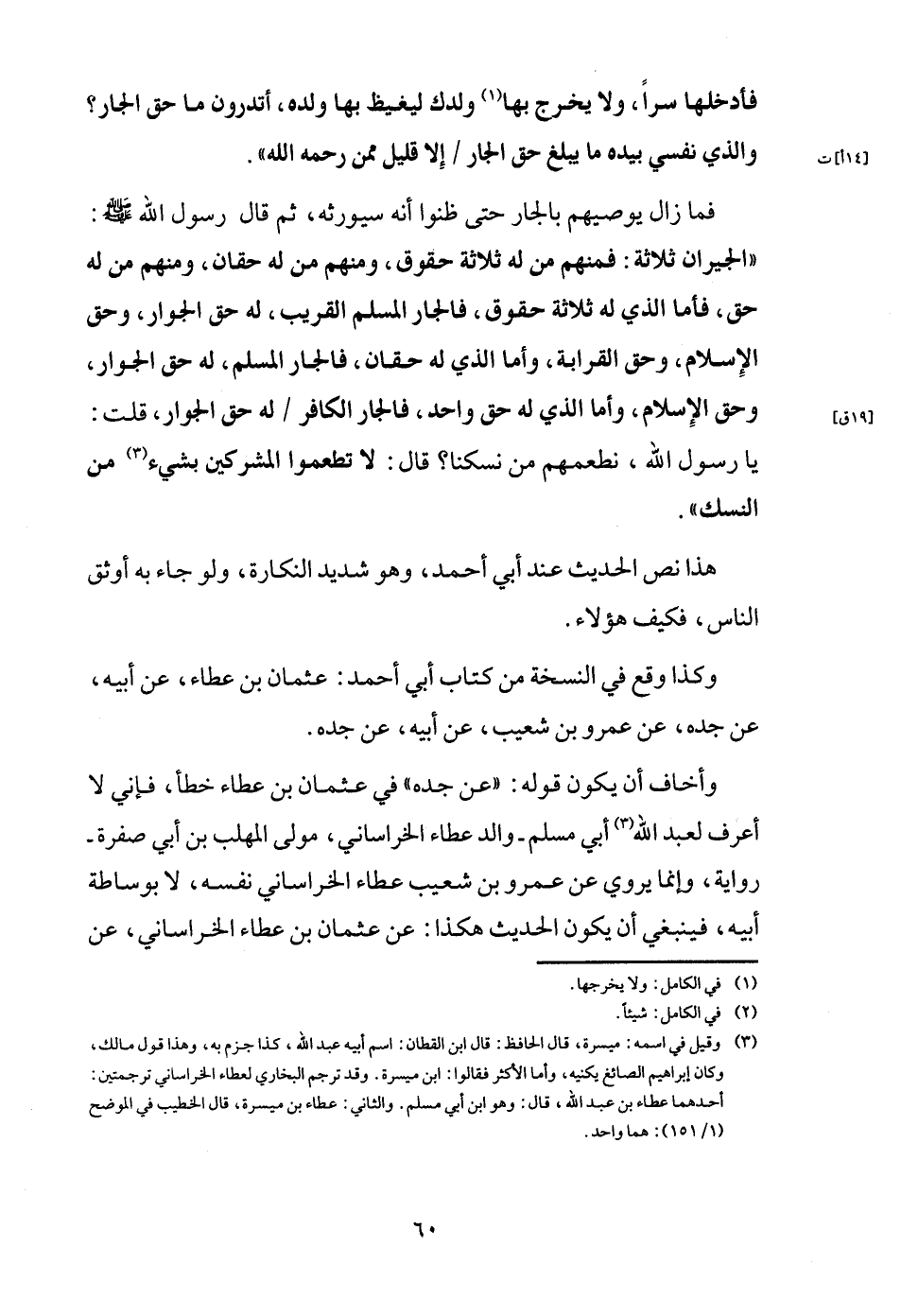 وأخاف أَن يكون قَوْله: " عَن جده " فِي عُثْمَان بن عَطاء خطأ، فَإِنِّي لَا أعرف لعبد الله أبي مُسلم - وَالِد عَطاء الْخُرَاسَانِي، مولى الْمُهلب بن أبي صفرَة - رِوَايَة، وَإِنَّمَا يروي عَن عَمْرو بن شُعَيْب عَطاء الْخُرَاسَانِي نَفسه، لَا بوساطة أَبِيه، فَيَنْبَغِي أَن يكون الحَدِيث هَكَذَا: عَن عُثْمَان بن عَطاء الْخُرَاسَانِي، عَن