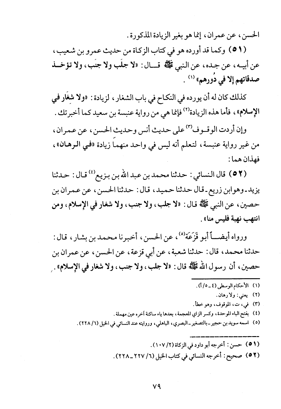 (52) قَالَ النَّسَائِيّ: حَدثنَا مُحَمَّد بن عبد الله بن بزيع قَالَ: حَدثنَا يزِيد - وَهُوَ ابْن زُرَيْع - قَالَ حَدثنَا حميد، قَالَ: حَدثنَا الْحسن، عَن عمرَان بن حُصَيْن، عَن النَّبِي - صَلَّى اللَّهُ عَلَيْهِ وَسَلَّم َ - قَالَ: " لَا جلب، وَلَا جنب، وَلَا شغار فِي الْإِسْلَام، وَمن انتهب نهبة فَلَيْسَ منا ".