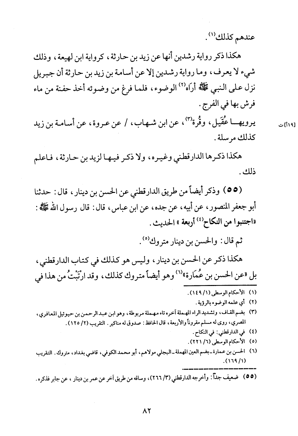ثمَّ قَالَ: وَالْحسن بن دِينَار مَتْرُوك. هَكَذَا ذكر عَن الْحسن بن دِينَار، وَلَيْسَ هُوَ كَذَلِك فِي كتاب الدَّارَقُطْنِيّ، بل " عَن الْحسن بن عمَارَة " وَهُوَ أَيْضا مَتْرُوك كَذَلِك، وَقد ارتبت من هَذَا فِي