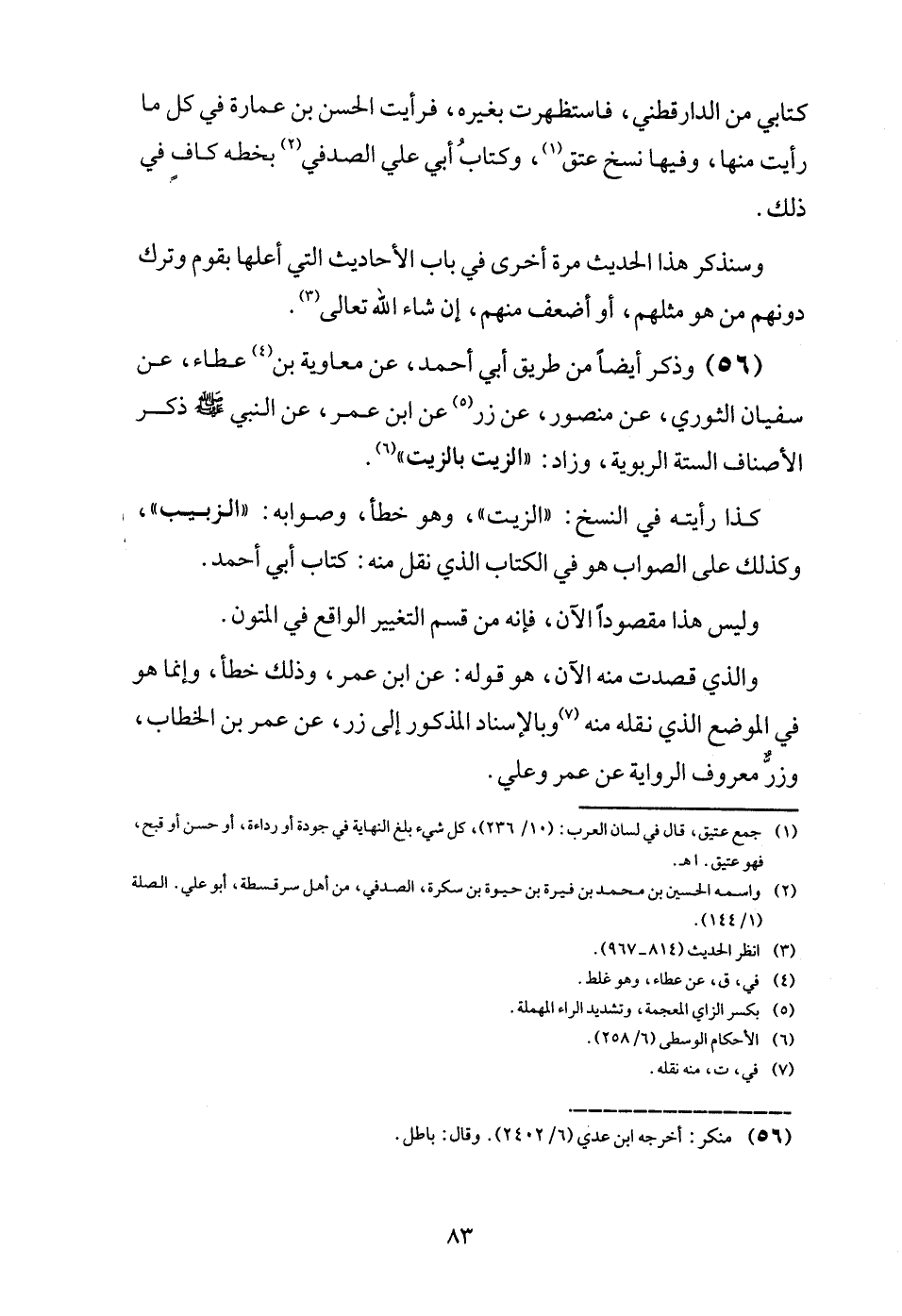 وَلَيْسَ هَذَا مَقْصُودا الْآن، فَإِنَّهُ من قسم التَّغْيِير الْوَاقِع فِي الْمُتُون. وَالَّذِي قصدت مِنْهُ الْآن، هُوَ قَوْله: عَن ابْن عمر، وَذَلِكَ خطأ، وَإِنَّمَا هُوَ فِي الْموضع الَّذِي نَقله مِنْهُ وَبِالْإِسْنَادِ الْمَذْكُور إِلَى زر، عَن عمر بن الْخطاب، وزر مَعْرُوف الرِّوَايَة عَن عمر وَعلي.
