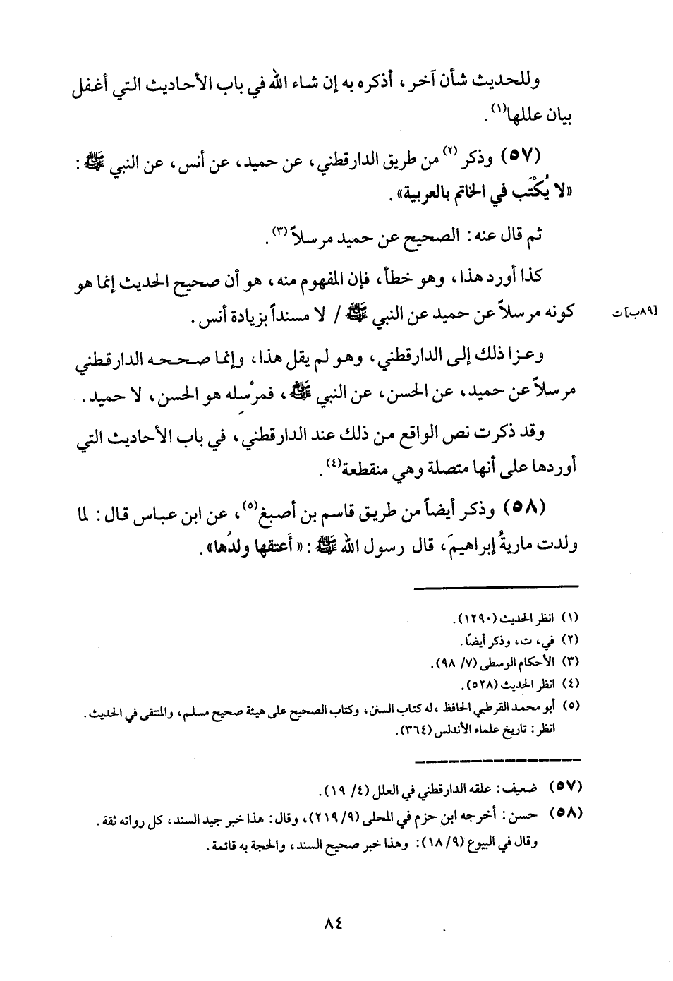 (57) وَذكر من طَرِيق الدَّارَقُطْنِيّ، عَن حميد، عَن أنس، عَن النَّبِي - صَلَّى اللَّهُ عَلَيْهِ وَسَلَّم َ - " لَا يكْتب فِي الْخَاتم بِالْعَرَبِيَّةِ ".