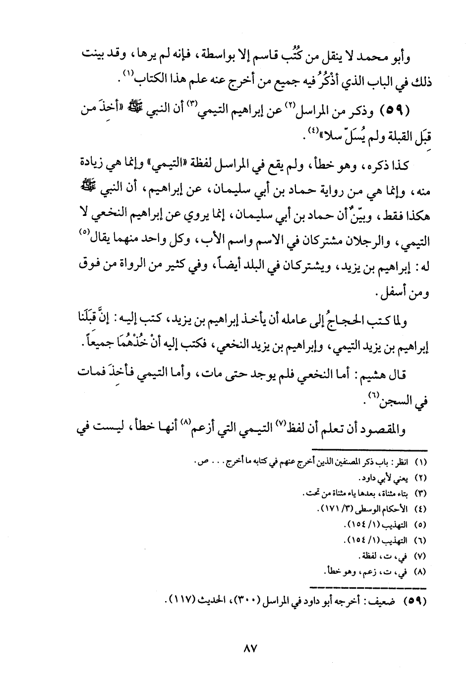 (59) وَذكر من المراسل عَن إِبْرَاهِيم التَّيْمِيّ أَن النَّبِي - صَلَّى اللَّهُ عَلَيْهِ وَسَلَّم َ - " أَخذ من قبل الْقبْلَة وَلم يسل سلا ".