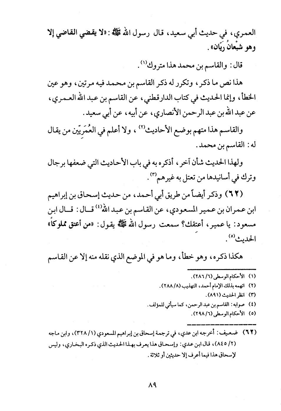 هَذَا نَص مَا ذكر، وتكرر لَهُ ذكر الْقَاسِم بن مُحَمَّد فِيهِ مرَّتَيْنِ، وَهُوَ عين الْخَطَأ، وَإِنَّمَا الحَدِيث فِي كتاب الدَّارَقُطْنِيّ، عَن الْقَاسِم بن عبد الله الْعمريّ عَن عبد الله بن عبد الرَّحْمَن الْأنْصَارِيّ، عَن أَبِيه، عَن أبي سعيد.