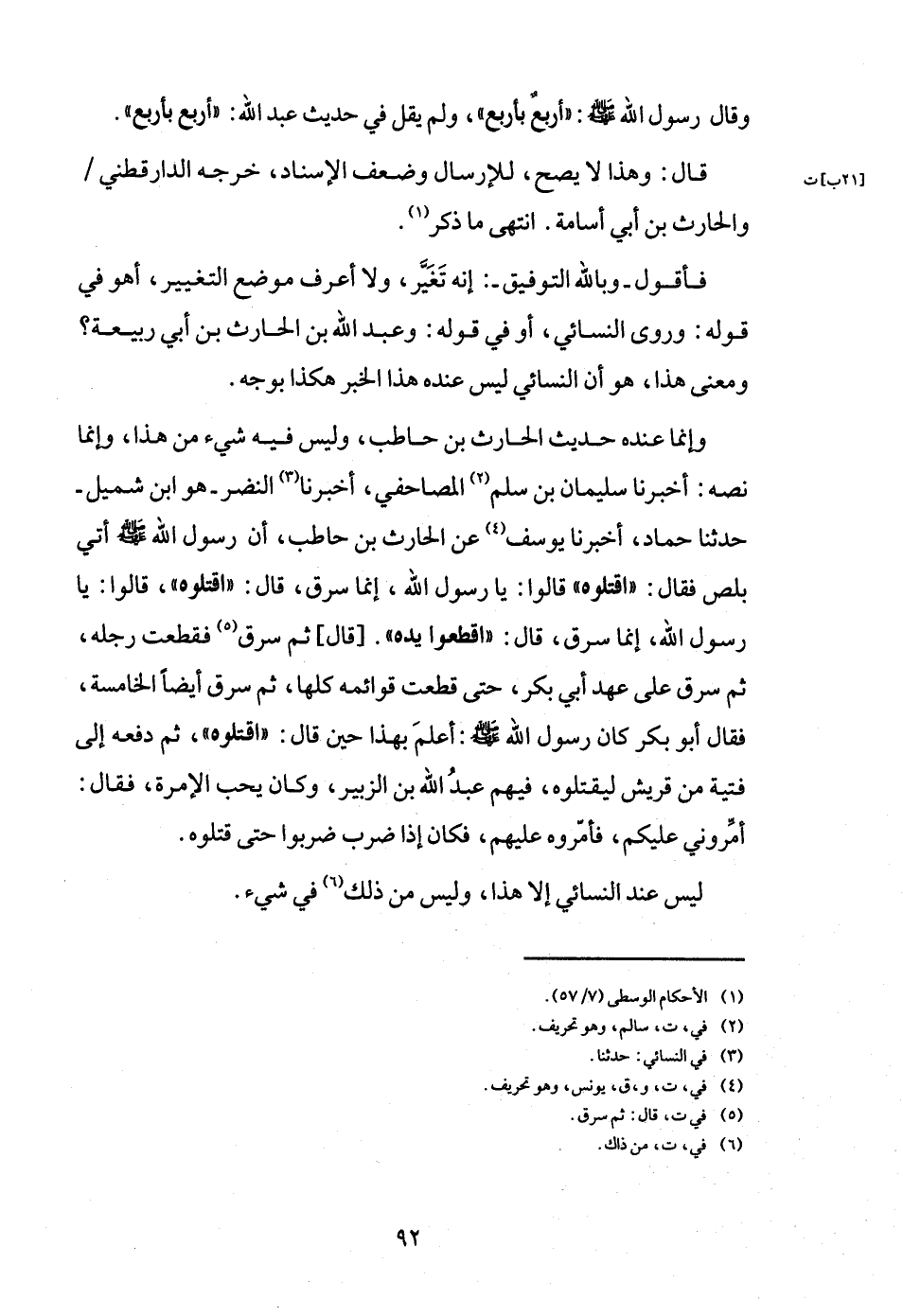 وَإِنَّمَا عِنْده حَدِيث الْحَارِث بن حَاطِب، وَلَيْسَ فِيهِ شَيْء من هَذَا، وَإِنَّمَا نَصه: أخبرنَا سُلَيْمَان بن سلم المصاحفي، أخبرنَا النَّضر - هُوَ ابْن شُمَيْل - حَدثنَا حَمَّاد، أخبرنَا يُوسُف عَن الْحَارِث بن حَاطِب، أَن رَسُول الله - صَلَّى اللَّهُ عَلَيْهِ وَسَلَّم َ - أُتِي بلص فَقَالَ: " اقْتُلُوهُ " قَالُوا: يَا رَسُول الله، إِنَّمَا سرق، قَالَ: " اقْتُلُوهُ "، قَالُوا: يَا رَسُول الله، إِنَّمَا سرق، قَالَ: " اقْطَعُوا يَده ". [قَالَ] ثمَّ سرق فَقطعت رجله ثمَّ سرق على عهد أبي بكر، حَتَّى قطعت قوائمه كلهَا، ثمَّ سرق أَيْضا الْخَامِسَة، فَقَالَ أَبُو بكر كَانَ رَسُول الله - صَلَّى اللَّهُ عَلَيْهِ وَسَلَّم َ -: أعلم بِهَذَا حِين قَالَ: " اقْتُلُوهُ "، ثمَّ دَفعه إِلَى فتية من قُرَيْش ليقتلوه، فيهم عبد الله بن الزبير، وَكَانَ يحب الإمرة، فَقَالَ: أمروني عَلَيْكُم، فأمروه عَلَيْهِم، فَكَانَ إِذا ضرب ضربوا حَتَّى قَتَلُوهُ.