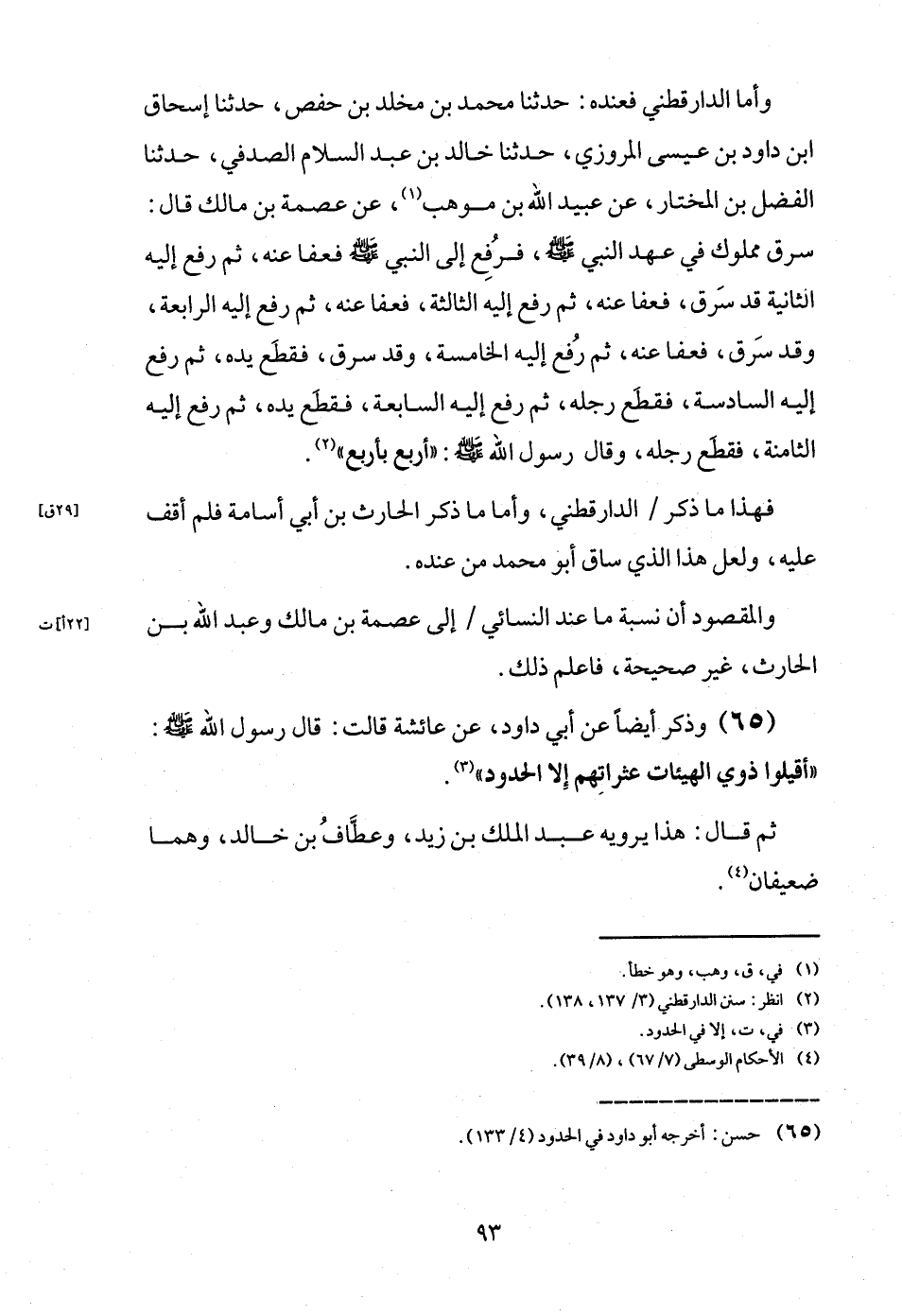 (65) وَذكر أَيْضا عَن أبي دَاوُد، عَن عَائِشَة قَالَت: قَالَ: قَالَ رَسُول الله - صَلَّى اللَّهُ عَلَيْهِ وَسَلَّم َ -: " أقيلوا ذَوي الهيئات عثراتهم إِلَّا الْحُدُود ".
