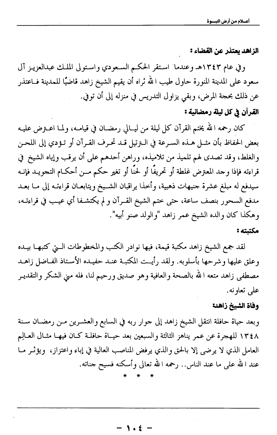 وفي عام 1343 هـ وعندما استقر الحكم السعودي واستولى الملك عبد العزيز آل سعود على المدينة المنورة حاول طيب الله ثراه أن يقيم الشيخ زاهد قاضياً للمدينة فاعتذر عن ذلك بحجة المرض، وبقي يزاول التدريس في منزله إلى أن توفي.