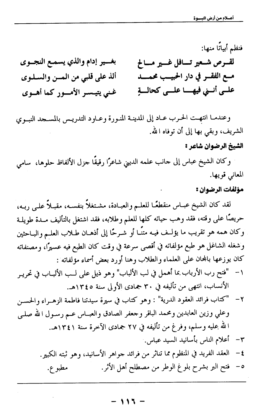 2 - " كتاب فرائد العقود الدرية ": وهو كتاب في سيرة سيدتنا فاطمة الزهراء والحسن وعلي وزين العابدين ومحمد الباقر وجعفر الصادق والعباس عم رسول الله صلى الله عليه وسلم، وفرغ من تأليفه في 27 جمادى الآخرة سنة 1341 هـ.